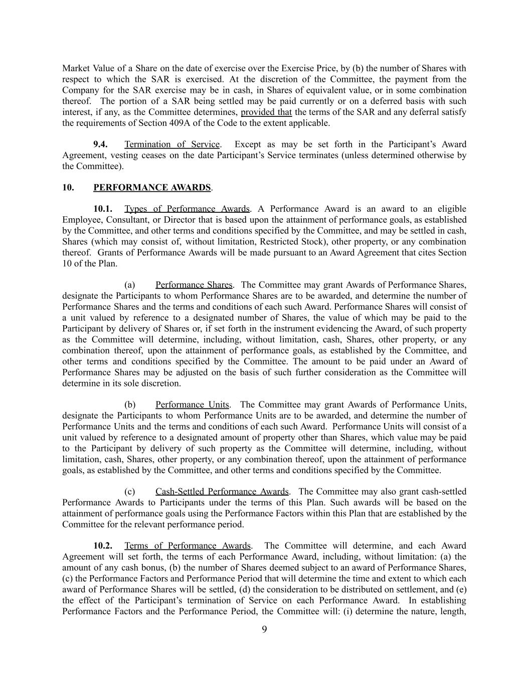 Market Value of a Share on the date of exercise over the Exercise Price, by (b) the number of Shares with respect to which the SAR is exercised. At the discretion of the Committee, the payment from the Company for the SAR exercise may be in cash, in Shares of equivalent value, or in some combination thereof. The portion of a SAR being settled may be paid currently or on a deferred basis with such interest, if any, as the Committee determines, provided that the terms of the SAR and any deferral satisfy the requirements of Section 409A of the Code to the extent applicable. 9.4. Termination of Service. Except as may be set forth in the Participant’s Award Agreement, vesting ceases on the date Participant’s Service terminates (unless determined otherwise by the Committee). 10. PERFORMANCE AWARDS. 10.1. Types of Performance Awards. A Performance Award is an award to an eligible Employee, Consultant, or Director that is based upon the attainment of performance goals, as established by the Committee, and other terms and conditions specified by the Committee, and may be settled in cash, Shares (which may consist of, without limitation, Restricted Stock), other property, or any combination thereof. Grants of Performance Awards will be made pursuant to an Award Agreement that cites Section 10 of the Plan. (a) Performance Shares. The Committee may grant Awards of Performance Shares, designate the Participants to whom Performance Shares are to be awarded, and determine the number of Performance Shares and the terms and conditions of each such Award. Performance Shares will consist of a unit valued by reference to a designated number of Shares, the value of which may be paid to the Participant by delivery of Shares or, if set forth in the instrument evidencing the Award, of such property as the Committee will determine, including, without limitation, cash, Shares, other property, or any combination thereof, upon the attainment of performance goals, as established by the Committee, and other terms and conditions specified by the Committee. The amount to be paid under an Award of Performance Shares may be adjusted on the basis of such further consideration as the Committee will determine in its sole discretion. (b) Performance Units. The Committee may grant Awards of Performance Units, designate the Participants to whom Performance Units are to be awarded, and determine the number of Performance Units and the terms and conditions of each such Award. Performance Units will consist of a unit valued by reference to a designated amount of property other than Shares, which value may be paid to the Participant by delivery of such property as the Committee will determine, including, without limitation, cash, Shares, other property, or any combination thereof, upon the attainment of performance goals, as established by the Committee, and other terms and conditions specified by the Committee. (c) Cash-Settled Performance Awards. The Committee may also grant cash-settled Performance Awards to Participants under the terms of this Plan. Such awards will be based on the attainment of performance goals using the Performance Factors within this Plan that are established by the Committee for the relevant performance period. 10.2. Terms of Performance Awards. The Committee will determine, and each Award Agreement will set forth, the terms of each Performance Award, including, without limitation: (a) the amount of any cash bonus, (b) the number of Shares deemed subject to an award of Performance Shares, (c) the Performance Factors and Performance Period that will determine the time and extent to which each award of Performance Shares will be settled, (d) the consideration to be distributed on settlement, and (e) the effect of the Participant’s termination of Service on each Performance Award. In establishing Performance Factors and the Performance Period, the Committee will: (i) determine the nature, length, 9