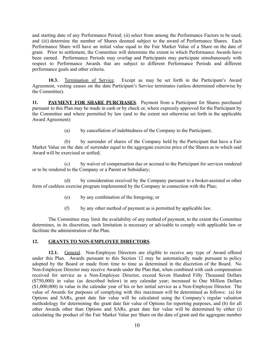 and starting date of any Performance Period; (ii) select from among the Performance Factors to be used; and (iii) determine the number of Shares deemed subject to the award of Performance Shares. Each Performance Share will have an initial value equal to the Fair Market Value of a Share on the date of grant. Prior to settlement, the Committee will determine the extent to which Performance Awards have been earned. Performance Periods may overlap and Participants may participate simultaneously with respect to Performance Awards that are subject to different Performance Periods and different performance goals and other criteria. 10.3. Termination of Service. Except as may be set forth in the Participant’s Award Agreement, vesting ceases on the date Participant’s Service terminates (unless determined otherwise by the Committee). 11. PAYMENT FOR SHARE PURCHASES. Payment from a Participant for Shares purchased pursuant to this Plan may be made in cash or by check or, where expressly approved for the Participant by the Committee and where permitted by law (and to the extent not otherwise set forth in the applicable Award Agreement): (a) by cancellation of indebtedness of the Company to the Participant; (b) by surrender of shares of the Company held by the Participant that have a Fair Market Value on the date of surrender equal to the aggregate exercise price of the Shares as to which said Award will be exercised or settled; (c) by waiver of compensation due or accrued to the Participant for services rendered or to be rendered to the Company or a Parent or Subsidiary; (d) by consideration received by the Company pursuant to a broker-assisted or other form of cashless exercise program implemented by the Company in connection with the Plan; (e) by any combination of the foregoing; or (f) by any other method of payment as is permitted by applicable law. The Committee may limit the availability of any method of payment, to the extent the Committee determines, in its discretion, such limitation is necessary or advisable to comply with applicable law or facilitate the administration of the Plan. 12. GRANTS TO NON-EMPLOYEE DIRECTORS. 12.1. General. Non-Employee Directors are eligible to receive any type of Award offered under this Plan. Awards pursuant to this Section 12 may be automatically made pursuant to policy adopted by the Board or made from time to time as determined in the discretion of the Board. No Non-Employee Director may receive Awards under the Plan that, when combined with cash compensation received for service as a Non-Employee Director, exceed Seven Hundred Fifty Thousand Dollars ($750,000) in value (as described below) in any calendar year; increased to One Million Dollars ($1,000,000) in value in the calendar year of his or her initial service as a Non-Employee Director. The value of Awards for purposes of complying with this maximum will be determined as follows: (a) for Options and SARs, grant date fair value will be calculated using the Company’s regular valuation methodology for determining the grant date fair value of Options for reporting purposes, and (b) for all other Awards other than Options and SARs, grant date fair value will be determined by either (i) calculating the product of the Fair Market Value per Share on the date of grant and the aggregate number 10