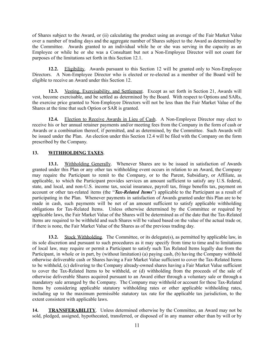 of Shares subject to the Award, or (ii) calculating the product using an average of the Fair Market Value over a number of trading days and the aggregate number of Shares subject to the Award as determined by the Committee. Awards granted to an individual while he or she was serving in the capacity as an Employee or while he or she was a Consultant but not a Non-Employee Director will not count for purposes of the limitations set forth in this Section 12.1. 12.2. Eligibility. Awards pursuant to this Section 12 will be granted only to Non-Employee Directors. A Non-Employee Director who is elected or re-elected as a member of the Board will be eligible to receive an Award under this Section 12. 12.3. Vesting, Exercisability, and Settlement. Except as set forth in Section 21, Awards will vest, become exercisable, and be settled as determined by the Board. With respect to Options and SARs, the exercise price granted to Non-Employee Directors will not be less than the Fair Market Value of the Shares at the time that such Option or SAR is granted. 12.4. Election to Receive Awards in Lieu of Cash. A Non-Employee Director may elect to receive his or her annual retainer payments and/or meeting fees from the Company in the form of cash or Awards or a combination thereof, if permitted, and as determined, by the Committee. Such Awards will be issued under the Plan. An election under this Section 12.4 will be filed with the Company on the form prescribed by the Company. 13. WITHHOLDING TAXES. 13.1. Withholding Generally. Whenever Shares are to be issued in satisfaction of Awards granted under this Plan or any other tax withholding event occurs in relation to an Award, the Company may require the Participant to remit to the Company, or to the Parent, Subsidiary, or Affiliate, as applicable, to which the Participant provides services an amount sufficient to satisfy any U.S. federal, state, and local, and non-U.S. income tax, social insurance, payroll tax, fringe benefits tax, payment on account or other tax-related items (the “Tax-Related Items”) applicable to the Participant as a result of participating in the Plan. Whenever payments in satisfaction of Awards granted under this Plan are to be made in cash, such payments will be net of an amount sufficient to satisfy applicable withholding obligations for Tax-Related Items. Unless otherwise determined by the Committee or required by applicable laws, the Fair Market Value of the Shares will be determined as of the date that the Tax-Related Items are required to be withheld and such Shares will be valued based on the value of the actual trade or, if there is none, the Fair Market Value of the Shares as of the previous trading day. 13.2. Stock Withholding. The Committee, or its delegate(s), as permitted by applicable law, in its sole discretion and pursuant to such procedures as it may specify from time to time and to limitations of local law, may require or permit a Participant to satisfy such Tax Related Items legally due from the Participant, in whole or in part, by (without limitation) (a) paying cash, (b) having the Company withhold otherwise deliverable cash or Shares having a Fair Market Value sufficient to cover the Tax-Related Items to be withheld, (c) delivering to the Company already-owned shares having a Fair Market Value sufficient to cover the Tax-Related Items to be withheld, or (d) withholding from the proceeds of the sale of otherwise deliverable Shares acquired pursuant to an Award either through a voluntary sale or through a mandatory sale arranged by the Company. The Company may withhold or account for these Tax-Related Items by considering applicable statutory withholding rates or other applicable withholding rates, including up to the maximum permissible statutory tax rate for the applicable tax jurisdiction, to the extent consistent with applicable laws. 14. TRANSFERABILITY. Unless determined otherwise by the Committee, an Award may not be sold, pledged, assigned, hypothecated, transferred, or disposed of in any manner other than by will or by 11