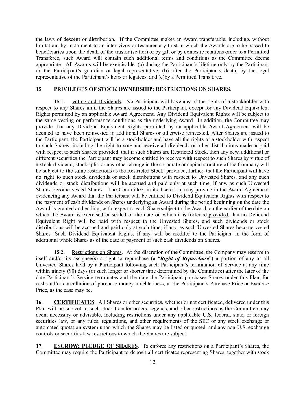 the laws of descent or distribution. If the Committee makes an Award transferable, including, without limitation, by instrument to an inter vivos or testamentary trust in which the Awards are to be passed to beneficiaries upon the death of the trustor (settlor) or by gift or by domestic relations order to a Permitted Transferee, such Award will contain such additional terms and conditions as the Committee deems appropriate. All Awards will be exercisable: (a) during the Participant’s lifetime only by the Participant or the Participant’s guardian or legal representative; (b) after the Participant’s death, by the legal representative of the Participant’s heirs or legatees; and (c)by a Permitted Transferee. 15. PRIVILEGES OF STOCK OWNERSHIP; RESTRICTIONS ON SHARES. 15.1. Voting and Dividends. No Participant will have any of the rights of a stockholder with respect to any Shares until the Shares are issued to the Participant, except for any Dividend Equivalent Rights permitted by an applicable Award Agreement. Any Dividend Equivalent Rights will be subject to the same vesting or performance conditions as the underlying Award. In addition, the Committee may provide that any Dividend Equivalent Rights permitted by an applicable Award Agreement will be deemed to have been reinvested in additional Shares or otherwise reinvested. After Shares are issued to the Participant, the Participant will be a stockholder and have all the rights of a stockholder with respect to such Shares, including the right to vote and receive all dividends or other distributions made or paid with respect to such Shares; provided, that if such Shares are Restricted Stock, then any new, additional or different securities the Participant may become entitled to receive with respect to such Shares by virtue of a stock dividend, stock split, or any other change in the corporate or capital structure of the Company will be subject to the same restrictions as the Restricted Stock; provided, further, that the Participant will have no right to such stock dividends or stock distributions with respect to Unvested Shares, and any such dividends or stock distributions will be accrued and paid only at such time, if any, as such Unvested Shares become vested Shares. The Committee, in its discretion, may provide in the Award Agreement evidencing any Award that the Participant will be entitled to Dividend Equivalent Rights with respect to the payment of cash dividends on Shares underlying an Award during the period beginning on the date the Award is granted and ending, with respect to each Share subject to the Award, on the earlier of the date on which the Award is exercised or settled or the date on which it is forfeited provided, that no Dividend Equivalent Right will be paid with respect to the Unvested Shares, and such dividends or stock distributions will be accrued and paid only at such time, if any, as such Unvested Shares become vested Shares. Such Dividend Equivalent Rights, if any, will be credited to the Participant in the form of additional whole Shares as of the date of payment of such cash dividends on Shares. 15.2. Restrictions on Shares. At the discretion of the Committee, the Company may reserve to itself and/or its assignee(s) a right to repurchase (a “Right of Repurchase”) a portion of any or all Unvested Shares held by a Participant following such Participant’s termination of Service at any time within ninety (90) days (or such longer or shorter time determined by the Committee) after the later of the date Participant’s Service terminates and the date the Participant purchases Shares under this Plan, for cash and/or cancellation of purchase money indebtedness, at the Participant’s Purchase Price or Exercise Price, as the case may be. 16. CERTIFICATES. All Shares or other securities, whether or not certificated, delivered under this Plan will be subject to such stock transfer orders, legends, and other restrictions as the Committee may deem necessary or advisable, including restrictions under any applicable U.S. federal, state, or foreign securities law, or any rules, regulations, and other requirements of the SEC or any stock exchange or automated quotation system upon which the Shares may be listed or quoted, and any non-U.S. exchange controls or securities law restrictions to which the Shares are subject. 17. ESCROW; PLEDGE OF SHARES. To enforce any restrictions on a Participant’s Shares, the Committee may require the Participant to deposit all certificates representing Shares, together with stock 12
