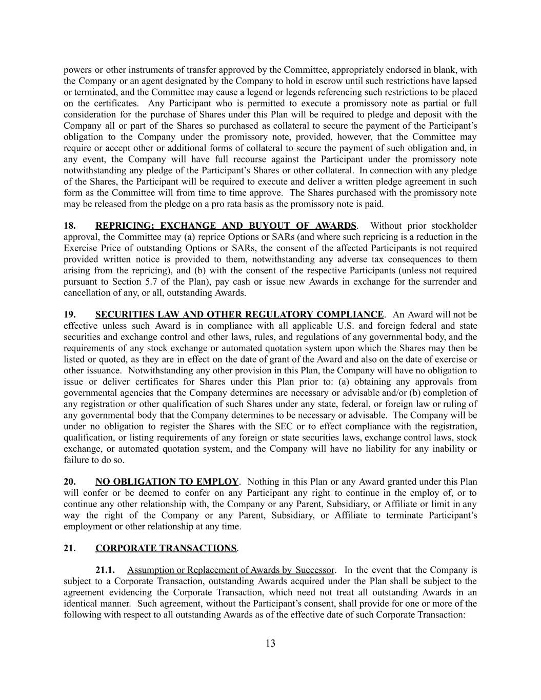 powers or other instruments of transfer approved by the Committee, appropriately endorsed in blank, with the Company or an agent designated by the Company to hold in escrow until such restrictions have lapsed or terminated, and the Committee may cause a legend or legends referencing such restrictions to be placed on the certificates. Any Participant who is permitted to execute a promissory note as partial or full consideration for the purchase of Shares under this Plan will be required to pledge and deposit with the Company all or part of the Shares so purchased as collateral to secure the payment of the Participant’s obligation to the Company under the promissory note, provided, however, that the Committee may require or accept other or additional forms of collateral to secure the payment of such obligation and, in any event, the Company will have full recourse against the Participant under the promissory note notwithstanding any pledge of the Participant’s Shares or other collateral. In connection with any pledge of the Shares, the Participant will be required to execute and deliver a written pledge agreement in such form as the Committee will from time to time approve. The Shares purchased with the promissory note may be released from the pledge on a pro rata basis as the promissory note is paid. 18. REPRICING; EXCHANGE AND BUYOUT OF AWARDS. Without prior stockholder approval, the Committee may (a) reprice Options or SARs (and where such repricing is a reduction in the Exercise Price of outstanding Options or SARs, the consent of the affected Participants is not required provided written notice is provided to them, notwithstanding any adverse tax consequences to them arising from the repricing), and (b) with the consent of the respective Participants (unless not required pursuant to Section 5.7 of the Plan), pay cash or issue new Awards in exchange for the surrender and cancellation of any, or all, outstanding Awards. 19. SECURITIES LAW AND OTHER REGULATORY COMPLIANCE. An Award will not be effective unless such Award is in compliance with all applicable U.S. and foreign federal and state securities and exchange control and other laws, rules, and regulations of any governmental body, and the requirements of any stock exchange or automated quotation system upon which the Shares may then be listed or quoted, as they are in effect on the date of grant of the Award and also on the date of exercise or other issuance. Notwithstanding any other provision in this Plan, the Company will have no obligation to issue or deliver certificates for Shares under this Plan prior to: (a) obtaining any approvals from governmental agencies that the Company determines are necessary or advisable and/or (b) completion of any registration or other qualification of such Shares under any state, federal, or foreign law or ruling of any governmental body that the Company determines to be necessary or advisable. The Company will be under no obligation to register the Shares with the SEC or to effect compliance with the registration, qualification, or listing requirements of any foreign or state securities laws, exchange control laws, stock exchange, or automated quotation system, and the Company will have no liability for any inability or failure to do so. 20. NO OBLIGATION TO EMPLOY. Nothing in this Plan or any Award granted under this Plan will confer or be deemed to confer on any Participant any right to continue in the employ of, or to continue any other relationship with, the Company or any Parent, Subsidiary, or Affiliate or limit in any way the right of the Company or any Parent, Subsidiary, or Affiliate to terminate Participant’s employment or other relationship at any time. 21. CORPORATE TRANSACTIONS. 21.1. Assumption or Replacement of Awards by Successor. In the event that the Company is subject to a Corporate Transaction, outstanding Awards acquired under the Plan shall be subject to the agreement evidencing the Corporate Transaction, which need not treat all outstanding Awards in an identical manner. Such agreement, without the Participant’s consent, shall provide for one or more of the following with respect to all outstanding Awards as of the effective date of such Corporate Transaction: 13