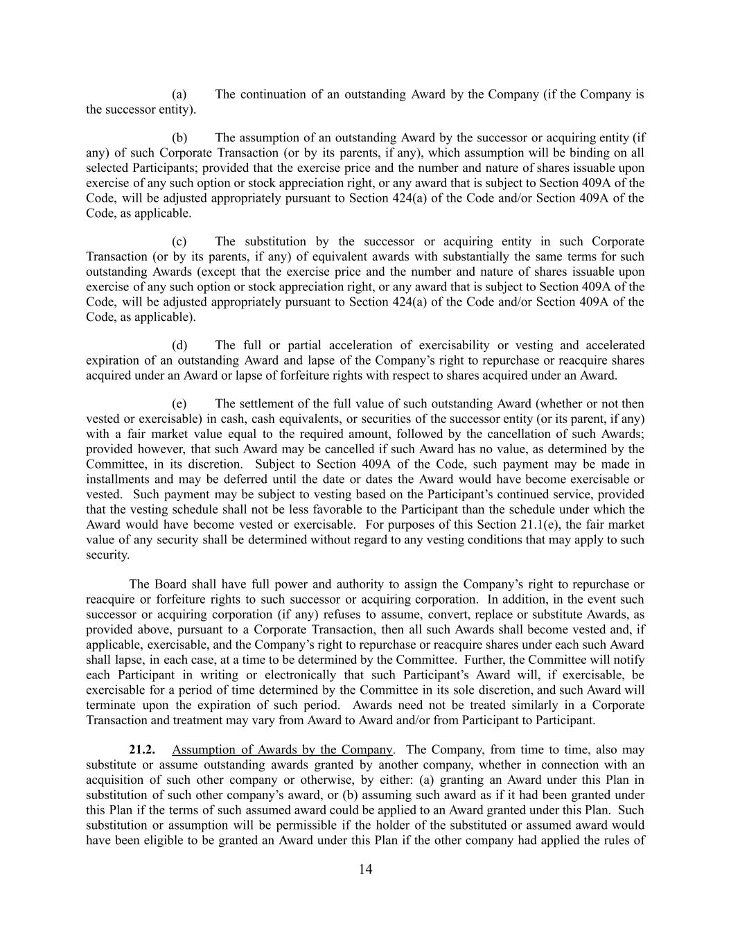 (a) The continuation of an outstanding Award by the Company (if the Company is the successor entity). (b) The assumption of an outstanding Award by the successor or acquiring entity (if any) of such Corporate Transaction (or by its parents, if any), which assumption will be binding on all selected Participants; provided that the exercise price and the number and nature of shares issuable upon exercise of any such option or stock appreciation right, or any award that is subject to Section 409A of the Code, will be adjusted appropriately pursuant to Section 424(a) of the Code and/or Section 409A of the Code, as applicable. (c) The substitution by the successor or acquiring entity in such Corporate Transaction (or by its parents, if any) of equivalent awards with substantially the same terms for such outstanding Awards (except that the exercise price and the number and nature of shares issuable upon exercise of any such option or stock appreciation right, or any award that is subject to Section 409A of the Code, will be adjusted appropriately pursuant to Section 424(a) of the Code and/or Section 409A of the Code, as applicable). (d) The full or partial acceleration of exercisability or vesting and accelerated expiration of an outstanding Award and lapse of the Company’s right to repurchase or reacquire shares acquired under an Award or lapse of forfeiture rights with respect to shares acquired under an Award. (e) The settlement of the full value of such outstanding Award (whether or not then vested or exercisable) in cash, cash equivalents, or securities of the successor entity (or its parent, if any) with a fair market value equal to the required amount, followed by the cancellation of such Awards; provided however, that such Award may be cancelled if such Award has no value, as determined by the Committee, in its discretion. Subject to Section 409A of the Code, such payment may be made in installments and may be deferred until the date or dates the Award would have become exercisable or vested. Such payment may be subject to vesting based on the Participant’s continued service, provided that the vesting schedule shall not be less favorable to the Participant than the schedule under which the Award would have become vested or exercisable. For purposes of this Section 21.1(e), the fair market value of any security shall be determined without regard to any vesting conditions that may apply to such security. The Board shall have full power and authority to assign the Company’s right to repurchase or reacquire or forfeiture rights to such successor or acquiring corporation. In addition, in the event such successor or acquiring corporation (if any) refuses to assume, convert, replace or substitute Awards, as provided above, pursuant to a Corporate Transaction, then all such Awards shall become vested and, if applicable, exercisable, and the Company’s right to repurchase or reacquire shares under each such Award shall lapse, in each case, at a time to be determined by the Committee. Further, the Committee will notify each Participant in writing or electronically that such Participant’s Award will, if exercisable, be exercisable for a period of time determined by the Committee in its sole discretion, and such Award will terminate upon the expiration of such period. Awards need not be treated similarly in a Corporate Transaction and treatment may vary from Award to Award and/or from Participant to Participant. 21.2. Assumption of Awards by the Company. The Company, from time to time, also may substitute or assume outstanding awards granted by another company, whether in connection with an acquisition of such other company or otherwise, by either: (a) granting an Award under this Plan in substitution of such other company’s award, or (b) assuming such award as if it had been granted under this Plan if the terms of such assumed award could be applied to an Award granted under this Plan. Such substitution or assumption will be permissible if the holder of the substituted or assumed award would have been eligible to be granted an Award under this Plan if the other company had applied the rules of 14