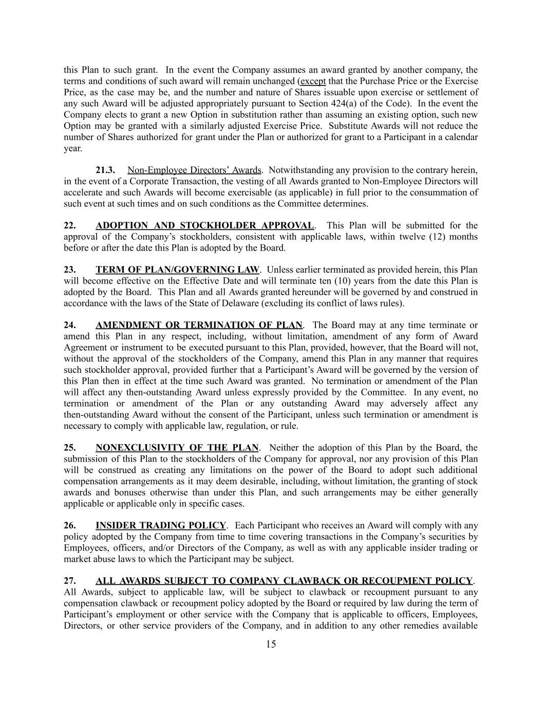this Plan to such grant. In the event the Company assumes an award granted by another company, the terms and conditions of such award will remain unchanged (except that the Purchase Price or the Exercise Price, as the case may be, and the number and nature of Shares issuable upon exercise or settlement of any such Award will be adjusted appropriately pursuant to Section 424(a) of the Code). In the event the Company elects to grant a new Option in substitution rather than assuming an existing option, such new Option may be granted with a similarly adjusted Exercise Price. Substitute Awards will not reduce the number of Shares authorized for grant under the Plan or authorized for grant to a Participant in a calendar year. 21.3. Non-Employee Directors’ Awards. Notwithstanding any provision to the contrary herein, in the event of a Corporate Transaction, the vesting of all Awards granted to Non-Employee Directors will accelerate and such Awards will become exercisable (as applicable) in full prior to the consummation of such event at such times and on such conditions as the Committee determines. 22. ADOPTION AND STOCKHOLDER APPROVAL. This Plan will be submitted for the approval of the Company’s stockholders, consistent with applicable laws, within twelve (12) months before or after the date this Plan is adopted by the Board. 23. TERM OF PLAN/GOVERNING LAW. Unless earlier terminated as provided herein, this Plan will become effective on the Effective Date and will terminate ten (10) years from the date this Plan is adopted by the Board. This Plan and all Awards granted hereunder will be governed by and construed in accordance with the laws of the State of Delaware (excluding its conflict of laws rules). 24. AMENDMENT OR TERMINATION OF PLAN. The Board may at any time terminate or amend this Plan in any respect, including, without limitation, amendment of any form of Award Agreement or instrument to be executed pursuant to this Plan, provided, however, that the Board will not, without the approval of the stockholders of the Company, amend this Plan in any manner that requires such stockholder approval, provided further that a Participant’s Award will be governed by the version of this Plan then in effect at the time such Award was granted. No termination or amendment of the Plan will affect any then-outstanding Award unless expressly provided by the Committee. In any event, no termination or amendment of the Plan or any outstanding Award may adversely affect any then-outstanding Award without the consent of the Participant, unless such termination or amendment is necessary to comply with applicable law, regulation, or rule. 25. NONEXCLUSIVITY OF THE PLAN. Neither the adoption of this Plan by the Board, the submission of this Plan to the stockholders of the Company for approval, nor any provision of this Plan will be construed as creating any limitations on the power of the Board to adopt such additional compensation arrangements as it may deem desirable, including, without limitation, the granting of stock awards and bonuses otherwise than under this Plan, and such arrangements may be either generally applicable or applicable only in specific cases. 26. INSIDER TRADING POLICY. Each Participant who receives an Award will comply with any policy adopted by the Company from time to time covering transactions in the Company’s securities by Employees, officers, and/or Directors of the Company, as well as with any applicable insider trading or market abuse laws to which the Participant may be subject. 27. ALL AWARDS SUBJECT TO COMPANY CLAWBACK OR RECOUPMENT POLICY. All Awards, subject to applicable law, will be subject to clawback or recoupment pursuant to any compensation clawback or recoupment policy adopted by the Board or required by law during the term of Participant’s employment or other service with the Company that is applicable to officers, Employees, Directors, or other service providers of the Company, and in addition to any other remedies available 15