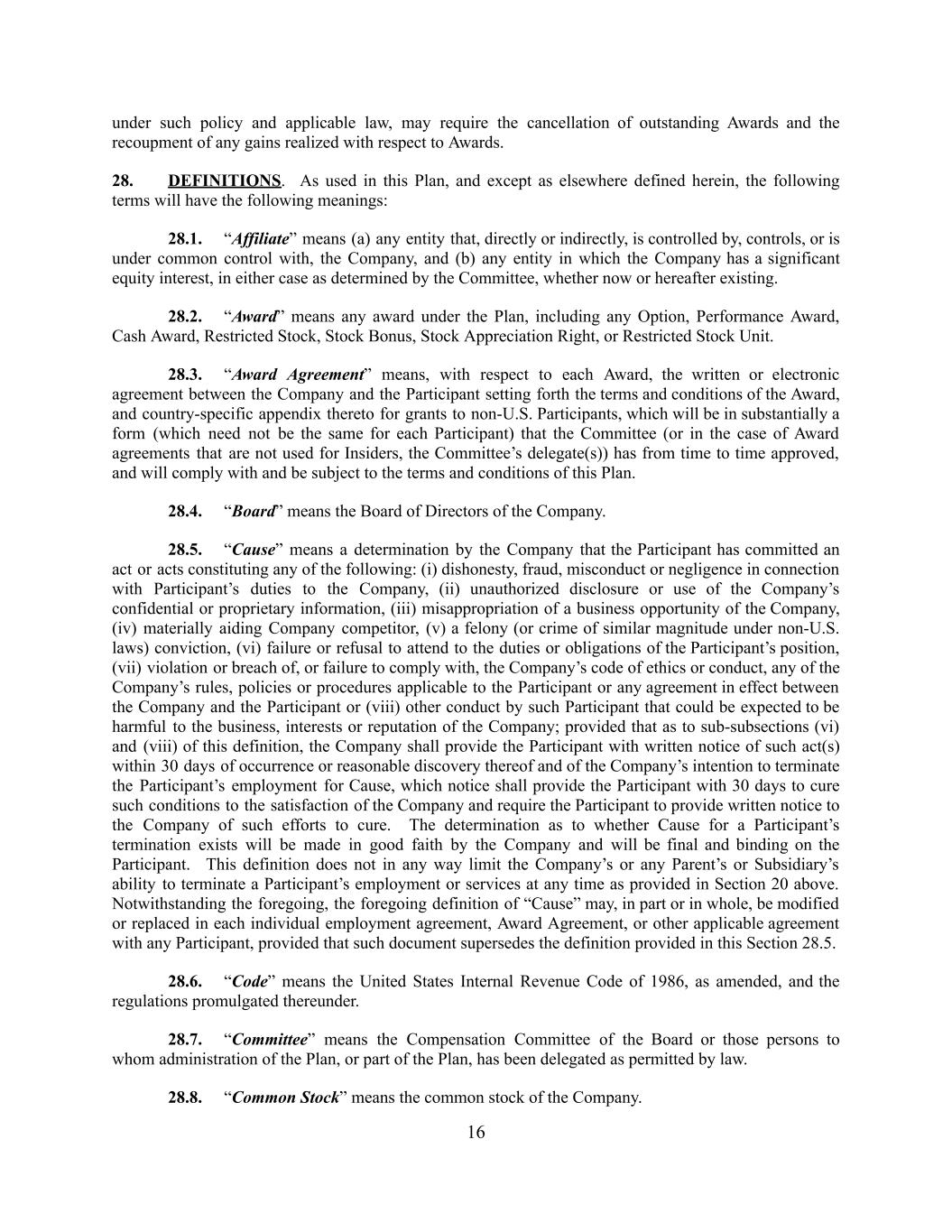 under such policy and applicable law, may require the cancellation of outstanding Awards and the recoupment of any gains realized with respect to Awards. 28. DEFINITIONS. As used in this Plan, and except as elsewhere defined herein, the following terms will have the following meanings: 28.1. “Affiliate” means (a) any entity that, directly or indirectly, is controlled by, controls, or is under common control with, the Company, and (b) any entity in which the Company has a significant equity interest, in either case as determined by the Committee, whether now or hereafter existing. 28.2. “Award” means any award under the Plan, including any Option, Performance Award, Cash Award, Restricted Stock, Stock Bonus, Stock Appreciation Right, or Restricted Stock Unit. 28.3. “Award Agreement” means, with respect to each Award, the written or electronic agreement between the Company and the Participant setting forth the terms and conditions of the Award, and country-specific appendix thereto for grants to non-U.S. Participants, which will be in substantially a form (which need not be the same for each Participant) that the Committee (or in the case of Award agreements that are not used for Insiders, the Committee’s delegate(s)) has from time to time approved, and will comply with and be subject to the terms and conditions of this Plan. 28.4. “Board” means the Board of Directors of the Company. 28.5. “Cause” means a determination by the Company that the Participant has committed an act or acts constituting any of the following: (i) dishonesty, fraud, misconduct or negligence in connection with Participant’s duties to the Company, (ii) unauthorized disclosure or use of the Company’s confidential or proprietary information, (iii) misappropriation of a business opportunity of the Company, (iv) materially aiding Company competitor, (v) a felony (or crime of similar magnitude under non-U.S. laws) conviction, (vi) failure or refusal to attend to the duties or obligations of the Participant’s position, (vii) violation or breach of, or failure to comply with, the Company’s code of ethics or conduct, any of the Company’s rules, policies or procedures applicable to the Participant or any agreement in effect between the Company and the Participant or (viii) other conduct by such Participant that could be expected to be harmful to the business, interests or reputation of the Company; provided that as to sub-subsections (vi) and (viii) of this definition, the Company shall provide the Participant with written notice of such act(s) within 30 days of occurrence or reasonable discovery thereof and of the Company’s intention to terminate the Participant’s employment for Cause, which notice shall provide the Participant with 30 days to cure such conditions to the satisfaction of the Company and require the Participant to provide written notice to the Company of such efforts to cure. The determination as to whether Cause for a Participant’s termination exists will be made in good faith by the Company and will be final and binding on the Participant. This definition does not in any way limit the Company’s or any Parent’s or Subsidiary’s ability to terminate a Participant’s employment or services at any time as provided in Section 20 above. Notwithstanding the foregoing, the foregoing definition of “Cause” may, in part or in whole, be modified or replaced in each individual employment agreement, Award Agreement, or other applicable agreement with any Participant, provided that such document supersedes the definition provided in this Section 28.5. 28.6. “Code” means the United States Internal Revenue Code of 1986, as amended, and the regulations promulgated thereunder. 28.7. “Committee” means the Compensation Committee of the Board or those persons to whom administration of the Plan, or part of the Plan, has been delegated as permitted by law. 28.8. “Common Stock” means the common stock of the Company. 16