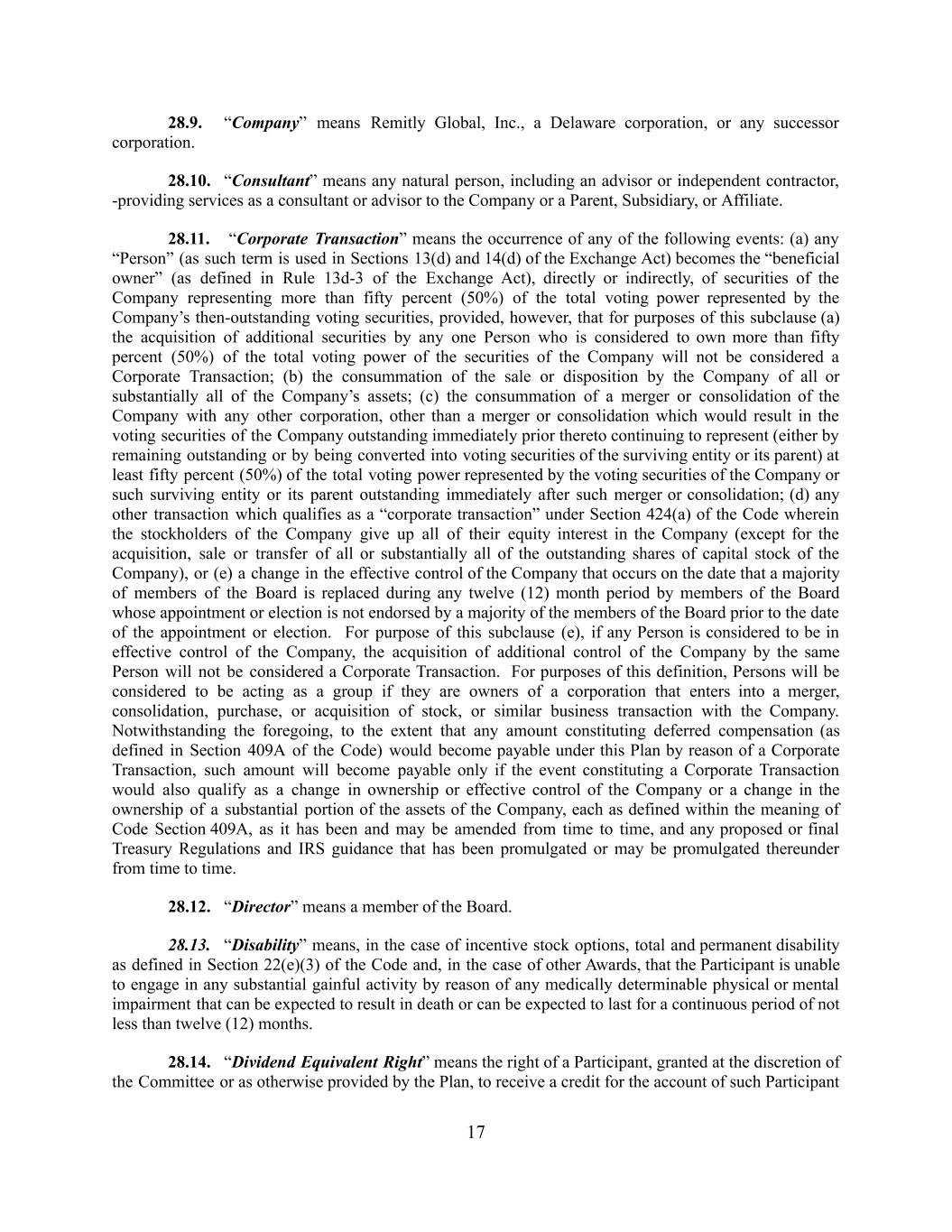 28.9. “Company” means Remitly Global, Inc., a Delaware corporation, or any successor corporation. 28.10. “Consultant” means any natural person, including an advisor or independent contractor, -providing services as a consultant or advisor to the Company or a Parent, Subsidiary, or Affiliate. 28.11. “Corporate Transaction” means the occurrence of any of the following events: (a) any “Person” (as such term is used in Sections 13(d) and 14(d) of the Exchange Act) becomes the “beneficial owner” (as defined in Rule 13d-3 of the Exchange Act), directly or indirectly, of securities of the Company representing more than fifty percent (50%) of the total voting power represented by the Company’s then-outstanding voting securities, provided, however, that for purposes of this subclause (a) the acquisition of additional securities by any one Person who is considered to own more than fifty percent (50%) of the total voting power of the securities of the Company will not be considered a Corporate Transaction; (b) the consummation of the sale or disposition by the Company of all or substantially all of the Company’s assets; (c) the consummation of a merger or consolidation of the Company with any other corporation, other than a merger or consolidation which would result in the voting securities of the Company outstanding immediately prior thereto continuing to represent (either by remaining outstanding or by being converted into voting securities of the surviving entity or its parent) at least fifty percent (50%) of the total voting power represented by the voting securities of the Company or such surviving entity or its parent outstanding immediately after such merger or consolidation; (d) any other transaction which qualifies as a “corporate transaction” under Section 424(a) of the Code wherein the stockholders of the Company give up all of their equity interest in the Company (except for the acquisition, sale or transfer of all or substantially all of the outstanding shares of capital stock of the Company), or (e) a change in the effective control of the Company that occurs on the date that a majority of members of the Board is replaced during any twelve (12) month period by members of the Board whose appointment or election is not endorsed by a majority of the members of the Board prior to the date of the appointment or election. For purpose of this subclause (e), if any Person is considered to be in effective control of the Company, the acquisition of additional control of the Company by the same Person will not be considered a Corporate Transaction. For purposes of this definition, Persons will be considered to be acting as a group if they are owners of a corporation that enters into a merger, consolidation, purchase, or acquisition of stock, or similar business transaction with the Company. Notwithstanding the foregoing, to the extent that any amount constituting deferred compensation (as defined in Section 409A of the Code) would become payable under this Plan by reason of a Corporate Transaction, such amount will become payable only if the event constituting a Corporate Transaction would also qualify as a change in ownership or effective control of the Company or a change in the ownership of a substantial portion of the assets of the Company, each as defined within the meaning of Code Section 409A, as it has been and may be amended from time to time, and any proposed or final Treasury Regulations and IRS guidance that has been promulgated or may be promulgated thereunder from time to time. 28.12. “Director” means a member of the Board. 28.13. “Disability” means, in the case of incentive stock options, total and permanent disability as defined in Section 22(e)(3) of the Code and, in the case of other Awards, that the Participant is unable to engage in any substantial gainful activity by reason of any medically determinable physical or mental impairment that can be expected to result in death or can be expected to last for a continuous period of not less than twelve (12) months. 28.14. “Dividend Equivalent Right” means the right of a Participant, granted at the discretion of the Committee or as otherwise provided by the Plan, to receive a credit for the account of such Participant 17