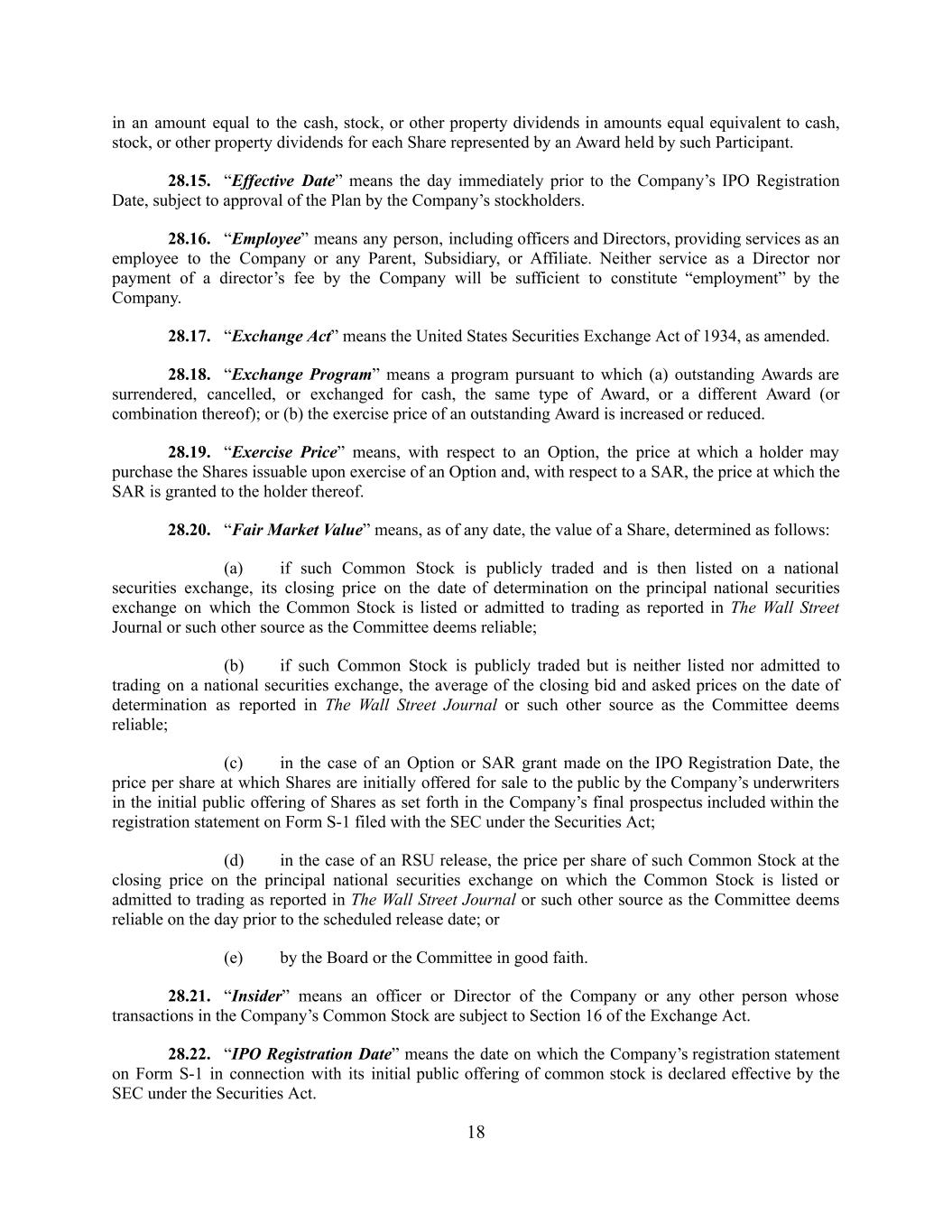 in an amount equal to the cash, stock, or other property dividends in amounts equal equivalent to cash, stock, or other property dividends for each Share represented by an Award held by such Participant. 28.15. “Effective Date” means the day immediately prior to the Company’s IPO Registration Date, subject to approval of the Plan by the Company’s stockholders. 28.16. “Employee” means any person, including officers and Directors, providing services as an employee to the Company or any Parent, Subsidiary, or Affiliate. Neither service as a Director nor payment of a director’s fee by the Company will be sufficient to constitute “employment” by the Company. 28.17. “Exchange Act” means the United States Securities Exchange Act of 1934, as amended. 28.18. “Exchange Program” means a program pursuant to which (a) outstanding Awards are surrendered, cancelled, or exchanged for cash, the same type of Award, or a different Award (or combination thereof); or (b) the exercise price of an outstanding Award is increased or reduced. 28.19. “Exercise Price” means, with respect to an Option, the price at which a holder may purchase the Shares issuable upon exercise of an Option and, with respect to a SAR, the price at which the SAR is granted to the holder thereof. 28.20. “Fair Market Value” means, as of any date, the value of a Share, determined as follows: (a) if such Common Stock is publicly traded and is then listed on a national securities exchange, its closing price on the date of determination on the principal national securities exchange on which the Common Stock is listed or admitted to trading as reported in The Wall Street Journal or such other source as the Committee deems reliable; (b) if such Common Stock is publicly traded but is neither listed nor admitted to trading on a national securities exchange, the average of the closing bid and asked prices on the date of determination as reported in The Wall Street Journal or such other source as the Committee deems reliable; (c) in the case of an Option or SAR grant made on the IPO Registration Date, the price per share at which Shares are initially offered for sale to the public by the Company’s underwriters in the initial public offering of Shares as set forth in the Company’s final prospectus included within the registration statement on Form S-1 filed with the SEC under the Securities Act; (d) in the case of an RSU release, the price per share of such Common Stock at the closing price on the principal national securities exchange on which the Common Stock is listed or admitted to trading as reported in The Wall Street Journal or such other source as the Committee deems reliable on the day prior to the scheduled release date; or (e) by the Board or the Committee in good faith. 28.21. “Insider” means an officer or Director of the Company or any other person whose transactions in the Company’s Common Stock are subject to Section 16 of the Exchange Act. 28.22. “IPO Registration Date” means the date on which the Company’s registration statement on Form S-1 in connection with its initial public offering of common stock is declared effective by the SEC under the Securities Act. 18