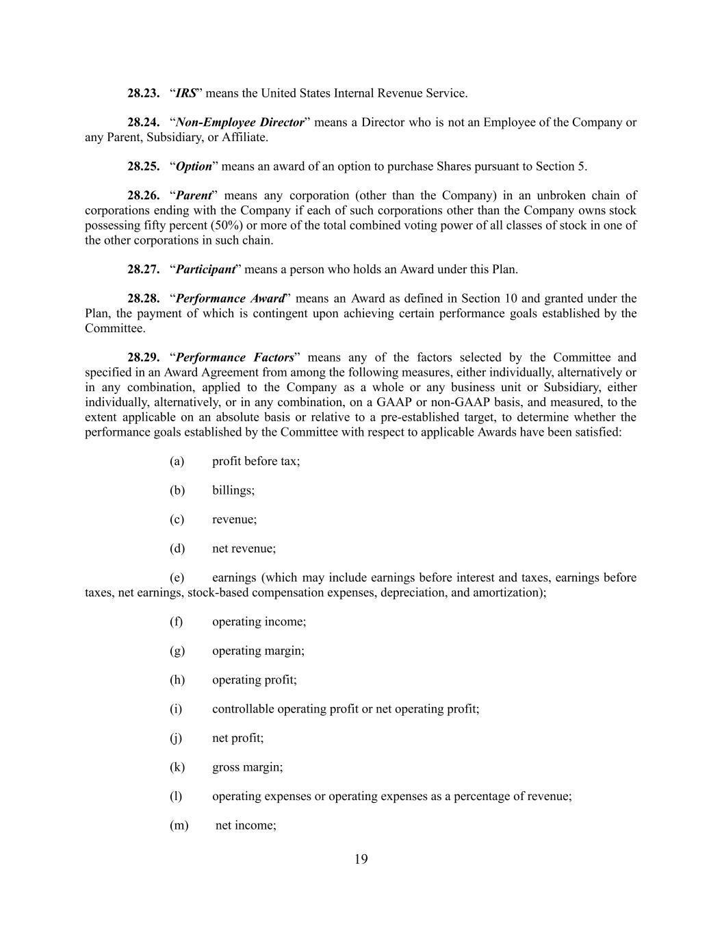 28.23. “IRS” means the United States Internal Revenue Service. 28.24. “Non-Employee Director” means a Director who is not an Employee of the Company or any Parent, Subsidiary, or Affiliate. 28.25. “Option” means an award of an option to purchase Shares pursuant to Section 5. 28.26. “Parent” means any corporation (other than the Company) in an unbroken chain of corporations ending with the Company if each of such corporations other than the Company owns stock possessing fifty percent (50%) or more of the total combined voting power of all classes of stock in one of the other corporations in such chain. 28.27. “Participant” means a person who holds an Award under this Plan. 28.28. “Performance Award” means an Award as defined in Section 10 and granted under the Plan, the payment of which is contingent upon achieving certain performance goals established by the Committee. 28.29. “Performance Factors” means any of the factors selected by the Committee and specified in an Award Agreement from among the following measures, either individually, alternatively or in any combination, applied to the Company as a whole or any business unit or Subsidiary, either individually, alternatively, or in any combination, on a GAAP or non-GAAP basis, and measured, to the extent applicable on an absolute basis or relative to a pre-established target, to determine whether the performance goals established by the Committee with respect to applicable Awards have been satisfied: (a) profit before tax; (b) billings; (c) revenue; (d) net revenue; (e) earnings (which may include earnings before interest and taxes, earnings before taxes, net earnings, stock-based compensation expenses, depreciation, and amortization); (f) operating income; (g) operating margin; (h) operating profit; (i) controllable operating profit or net operating profit; (j) net profit; (k) gross margin; (l) operating expenses or operating expenses as a percentage of revenue; (m) net income; 19
