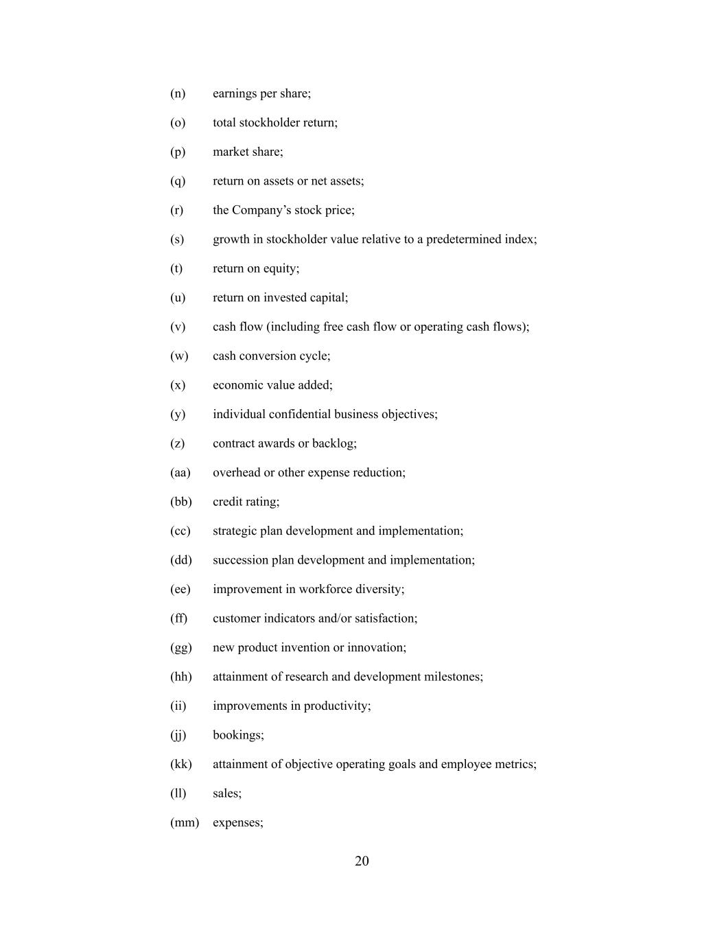 (n) earnings per share; (o) total stockholder return; (p) market share; (q) return on assets or net assets; (r) the Company’s stock price; (s) growth in stockholder value relative to a predetermined index; (t) return on equity; (u) return on invested capital; (v) cash flow (including free cash flow or operating cash flows); (w) cash conversion cycle; (x) economic value added; (y) individual confidential business objectives; (z) contract awards or backlog; (aa) overhead or other expense reduction; (bb) credit rating; (cc) strategic plan development and implementation; (dd) succession plan development and implementation; (ee) improvement in workforce diversity; (ff) customer indicators and/or satisfaction; (gg) new product invention or innovation; (hh) attainment of research and development milestones; (ii) improvements in productivity; (jj) bookings; (kk) attainment of objective operating goals and employee metrics; (ll) sales; (mm) expenses; 20