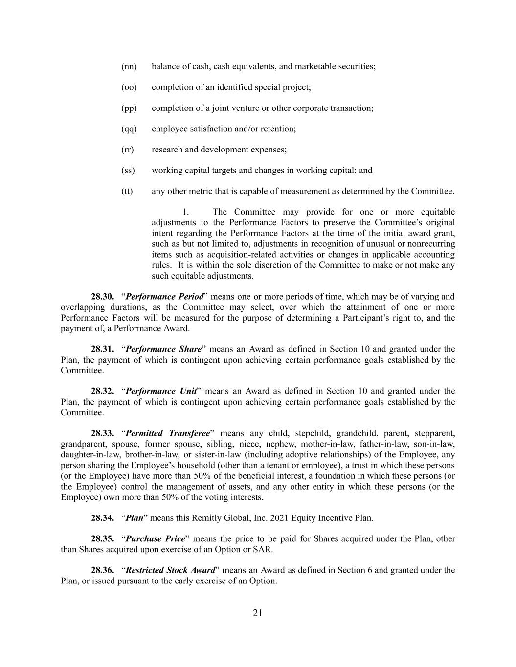 (nn) balance of cash, cash equivalents, and marketable securities; (oo) completion of an identified special project; (pp) completion of a joint venture or other corporate transaction; (qq) employee satisfaction and/or retention; (rr) research and development expenses; (ss) working capital targets and changes in working capital; and (tt) any other metric that is capable of measurement as determined by the Committee. 1. The Committee may provide for one or more equitable adjustments to the Performance Factors to preserve the Committee’s original intent regarding the Performance Factors at the time of the initial award grant, such as but not limited to, adjustments in recognition of unusual or nonrecurring items such as acquisition-related activities or changes in applicable accounting rules. It is within the sole discretion of the Committee to make or not make any such equitable adjustments. 28.30. “Performance Period” means one or more periods of time, which may be of varying and overlapping durations, as the Committee may select, over which the attainment of one or more Performance Factors will be measured for the purpose of determining a Participant’s right to, and the payment of, a Performance Award. 28.31. “Performance Share” means an Award as defined in Section 10 and granted under the Plan, the payment of which is contingent upon achieving certain performance goals established by the Committee. 28.32. “Performance Unit” means an Award as defined in Section 10 and granted under the Plan, the payment of which is contingent upon achieving certain performance goals established by the Committee. 28.33. “Permitted Transferee” means any child, stepchild, grandchild, parent, stepparent, grandparent, spouse, former spouse, sibling, niece, nephew, mother-in-law, father-in-law, son-in-law, daughter-in-law, brother-in-law, or sister-in-law (including adoptive relationships) of the Employee, any person sharing the Employee’s household (other than a tenant or employee), a trust in which these persons (or the Employee) have more than 50% of the beneficial interest, a foundation in which these persons (or the Employee) control the management of assets, and any other entity in which these persons (or the Employee) own more than 50% of the voting interests. 28.34. “Plan” means this Remitly Global, Inc. 2021 Equity Incentive Plan. 28.35. “Purchase Price” means the price to be paid for Shares acquired under the Plan, other than Shares acquired upon exercise of an Option or SAR. 28.36. “Restricted Stock Award” means an Award as defined in Section 6 and granted under the Plan, or issued pursuant to the early exercise of an Option. 21