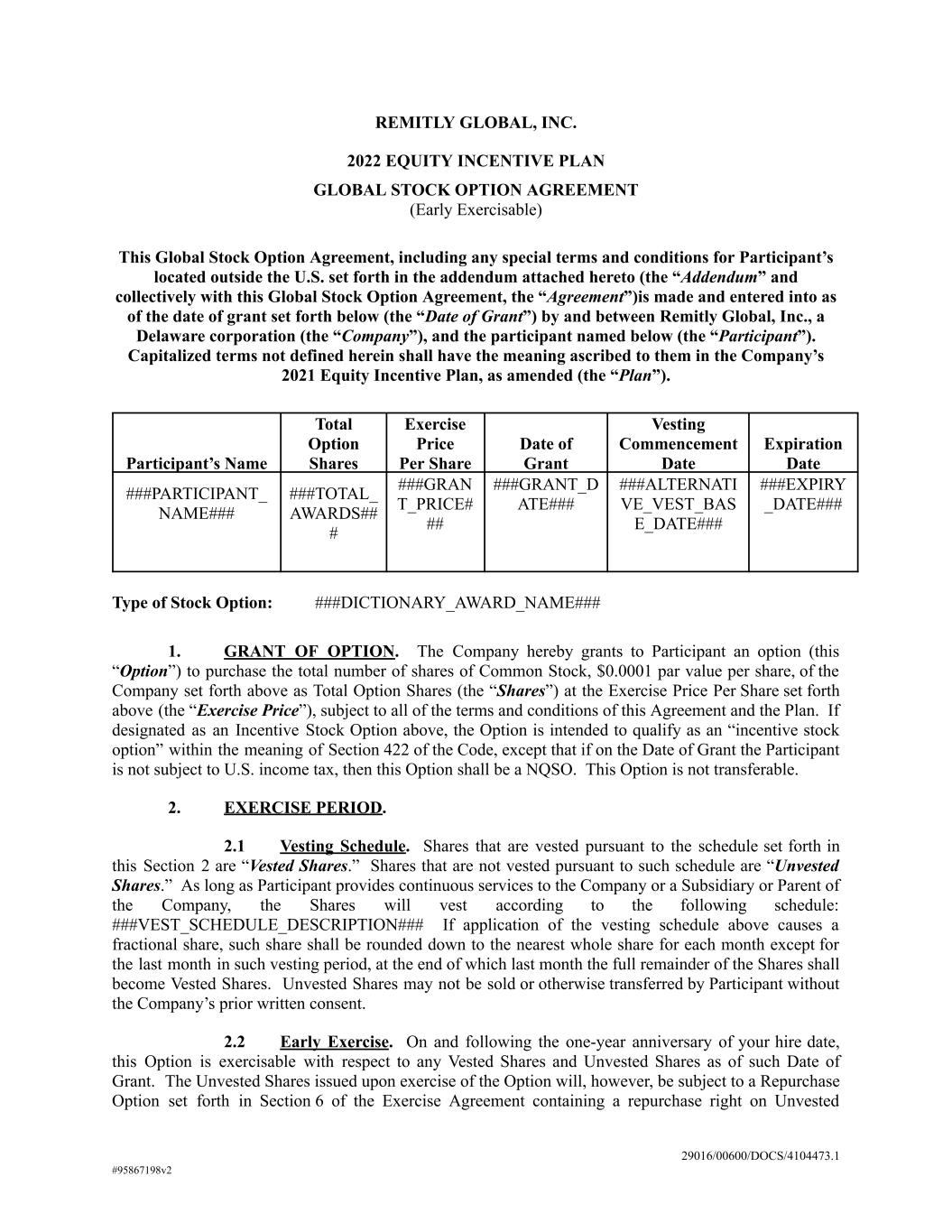 REMITLY GLOBAL, INC. 2022 EQUITY INCENTIVE PLAN GLOBAL STOCK OPTION AGREEMENT (Early Exercisable) This Global Stock Option Agreement, including any special terms and conditions for Participant’s located outside the U.S. set forth in the addendum attached hereto (the “Addendum” and collectively with this Global Stock Option Agreement, the “Agreement”)is made and entered into as of the date of grant set forth below (the “Date of Grant”) by and between Remitly Global, Inc., a Delaware corporation (the “Company”), and the participant named below (the “Participant”). Capitalized terms not defined herein shall have the meaning ascribed to them in the Company’s 2021 Equity Incentive Plan, as amended (the “Plan”). Participant’s Name Total Option Shares Exercise Price Per Share Date of Grant Vesting Commencement Date Expiration Date ###PARTICIPANT_ NAME### ###TOTAL_ AWARDS## # ###GRAN T_PRICE# ## ###GRANT_D ATE### ###ALTERNATI VE_VEST_BAS E_DATE### ###EXPIRY _DATE### Type of Stock Option: ###DICTIONARY_AWARD_NAME### 1. GRANT OF OPTION. The Company hereby grants to Participant an option (this “Option”) to purchase the total number of shares of Common Stock, $0.0001 par value per share, of the Company set forth above as Total Option Shares (the “Shares”) at the Exercise Price Per Share set forth above (the “Exercise Price”), subject to all of the terms and conditions of this Agreement and the Plan. If designated as an Incentive Stock Option above, the Option is intended to qualify as an “incentive stock option” within the meaning of Section 422 of the Code, except that if on the Date of Grant the Participant is not subject to U.S. income tax, then this Option shall be a NQSO. This Option is not transferable. 2. EXERCISE PERIOD. 2.1 Vesting Schedule. Shares that are vested pursuant to the schedule set forth in this Section 2 are “Vested Shares.” Shares that are not vested pursuant to such schedule are “Unvested Shares.” As long as Participant provides continuous services to the Company or a Subsidiary or Parent of the Company, the Shares will vest according to the following schedule: ###VEST_SCHEDULE_DESCRIPTION### If application of the vesting schedule above causes a fractional share, such share shall be rounded down to the nearest whole share for each month except for the last month in such vesting period, at the end of which last month the full remainder of the Shares shall become Vested Shares. Unvested Shares may not be sold or otherwise transferred by Participant without the Company’s prior written consent. 2.2 Early Exercise. On and following the one-year anniversary of your hire date, this Option is exercisable with respect to any Vested Shares and Unvested Shares as of such Date of Grant. The Unvested Shares issued upon exercise of the Option will, however, be subject to a Repurchase Option set forth in Section 6 of the Exercise Agreement containing a repurchase right on Unvested 29016/00600/DOCS/4104473.1 #95867198v2