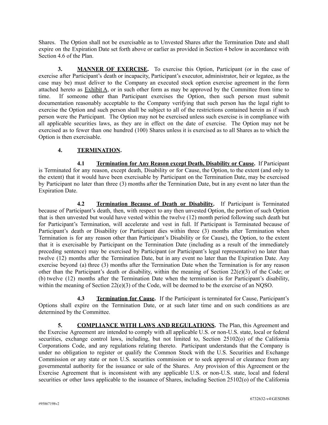 Shares. The Option shall not be exercisable as to Unvested Shares after the Termination Date and shall expire on the Expiration Date set forth above or earlier as provided in Section 4 below in accordance with Section 4.6 of the Plan. 3. MANNER OF EXERCISE. To exercise this Option, Participant (or in the case of exercise after Participant’s death or incapacity, Participant’s executor, administrator, heir or legatee, as the case may be) must deliver to the Company an executed stock option exercise agreement in the form attached hereto as Exhibit A, or in such other form as may be approved by the Committee from time to time. If someone other than Participant exercises the Option, then such person must submit documentation reasonably acceptable to the Company verifying that such person has the legal right to exercise the Option and such person shall be subject to all of the restrictions contained herein as if such person were the Participant. The Option may not be exercised unless such exercise is in compliance with all applicable securities laws, as they are in effect on the date of exercise. The Option may not be exercised as to fewer than one hundred (100) Shares unless it is exercised as to all Shares as to which the Option is then exercisable. 4. TERMINATION. 4.1 Termination for Any Reason except Death, Disability or Cause. If Participant is Terminated for any reason, except death, Disability or for Cause, the Option, to the extent (and only to the extent) that it would have been exercisable by Participant on the Termination Date, may be exercised by Participant no later than three (3) months after the Termination Date, but in any event no later than the Expiration Date. 4.2 Termination Because of Death or Disability. If Participant is Terminated because of Participant’s death, then, with respect to any then unvested Option, the portion of such Option that is then unvested but would have vested within the twelve (12) month period following such death but for Participant’s Termination, will accelerate and vest in full. If Participant is Terminated because of Participant’s death or Disability (or Participant dies within three (3) months after Termination when Termination is for any reason other than Participant’s Disability or for Cause), the Option, to the extent that it is exercisable by Participant on the Termination Date (including as a result of the immediately preceding sentence) may be exercised by Participant (or Participant’s legal representative) no later than twelve (12) months after the Termination Date, but in any event no later than the Expiration Date. Any exercise beyond (a) three (3) months after the Termination Date when the Termination is for any reason other than the Participant’s death or disability, within the meaning of Section 22(e)(3) of the Code; or (b) twelve (12) months after the Termination Date when the termination is for Participant’s disability, within the meaning of Section 22(e)(3) of the Code, will be deemed to be the exercise of an NQSO. 4.3 Termination for Cause. If the Participant is terminated for Cause, Participant’s Options shall expire on the Termination Date, or at such later time and on such conditions as are determined by the Committee. 5. COMPLIANCE WITH LAWS AND REGULATIONS. The Plan, this Agreement and the Exercise Agreement are intended to comply with all applicable U.S. or non-U.S. state, local or federal securities, exchange control laws, including, but not limited to, Section 25102(o) of the California Corporations Code, and any regulations relating thereto. Participant understands that the Company is under no obligation to register or qualify the Common Stock with the U.S. Securities and Exchange Commission or any state or non U.S. securities commission or to seek approval or clearance from any governmental authority for the issuance or sale of the Shares. Any provision of this Agreement or the Exercise Agreement that is inconsistent with any applicable U.S. or non-U.S. state, local and federal securities or other laws applicable to the issuance of Shares, including Section 25102(o) of the California 6732632-v4\GESDMS #95867198v2