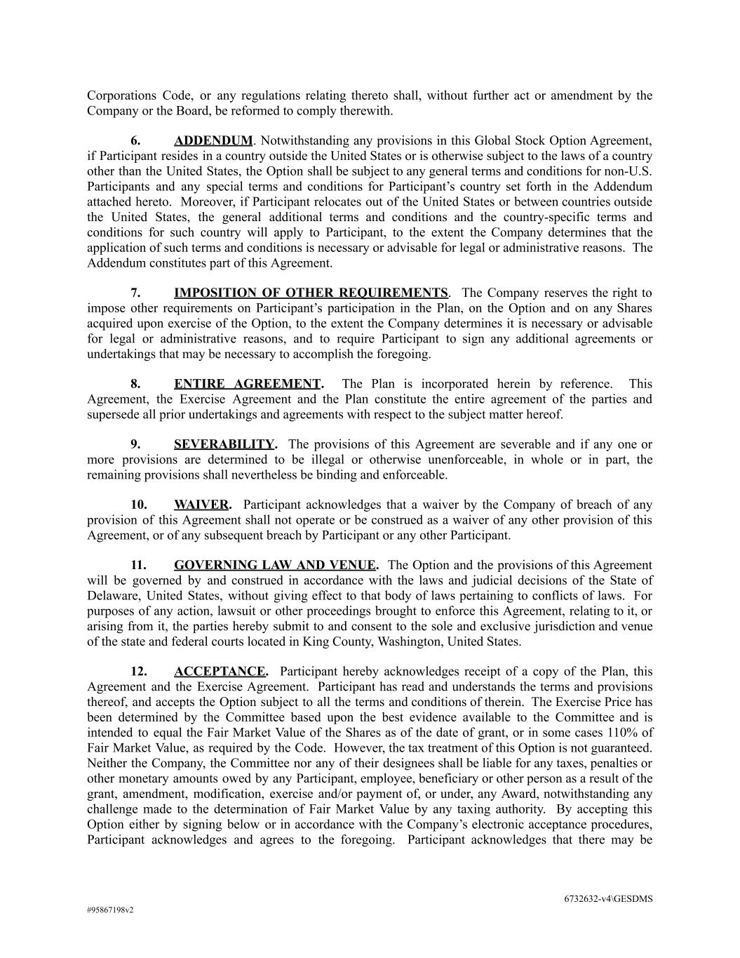 Corporations Code, or any regulations relating thereto shall, without further act or amendment by the Company or the Board, be reformed to comply therewith. 6. ADDENDUM. Notwithstanding any provisions in this Global Stock Option Agreement, if Participant resides in a country outside the United States or is otherwise subject to the laws of a country other than the United States, the Option shall be subject to any general terms and conditions for non-U.S. Participants and any special terms and conditions for Participant’s country set forth in the Addendum attached hereto. Moreover, if Participant relocates out of the United States or between countries outside the United States, the general additional terms and conditions and the country-specific terms and conditions for such country will apply to Participant, to the extent the Company determines that the application of such terms and conditions is necessary or advisable for legal or administrative reasons. The Addendum constitutes part of this Agreement. 7. IMPOSITION OF OTHER REQUIREMENTS. The Company reserves the right to impose other requirements on Participant’s participation in the Plan, on the Option and on any Shares acquired upon exercise of the Option, to the extent the Company determines it is necessary or advisable for legal or administrative reasons, and to require Participant to sign any additional agreements or undertakings that may be necessary to accomplish the foregoing. 8. ENTIRE AGREEMENT. The Plan is incorporated herein by reference. This Agreement, the Exercise Agreement and the Plan constitute the entire agreement of the parties and supersede all prior undertakings and agreements with respect to the subject matter hereof. 9. SEVERABILITY. The provisions of this Agreement are severable and if any one or more provisions are determined to be illegal or otherwise unenforceable, in whole or in part, the remaining provisions shall nevertheless be binding and enforceable. 10. WAIVER. Participant acknowledges that a waiver by the Company of breach of any provision of this Agreement shall not operate or be construed as a waiver of any other provision of this Agreement, or of any subsequent breach by Participant or any other Participant. 11. GOVERNING LAW AND VENUE. The Option and the provisions of this Agreement will be governed by and construed in accordance with the laws and judicial decisions of the State of Delaware, United States, without giving effect to that body of laws pertaining to conflicts of laws. For purposes of any action, lawsuit or other proceedings brought to enforce this Agreement, relating to it, or arising from it, the parties hereby submit to and consent to the sole and exclusive jurisdiction and venue of the state and federal courts located in King County, Washington, United States. 12. ACCEPTANCE. Participant hereby acknowledges receipt of a copy of the Plan, this Agreement and the Exercise Agreement. Participant has read and understands the terms and provisions thereof, and accepts the Option subject to all the terms and conditions of therein. The Exercise Price has been determined by the Committee based upon the best evidence available to the Committee and is intended to equal the Fair Market Value of the Shares as of the date of grant, or in some cases 110% of Fair Market Value, as required by the Code. However, the tax treatment of this Option is not guaranteed. Neither the Company, the Committee nor any of their designees shall be liable for any taxes, penalties or other monetary amounts owed by any Participant, employee, beneficiary or other person as a result of the grant, amendment, modification, exercise and/or payment of, or under, any Award, notwithstanding any challenge made to the determination of Fair Market Value by any taxing authority. By accepting this Option either by signing below or in accordance with the Company’s electronic acceptance procedures, Participant acknowledges and agrees to the foregoing. Participant acknowledges that there may be 6732632-v4\GESDMS #95867198v2
