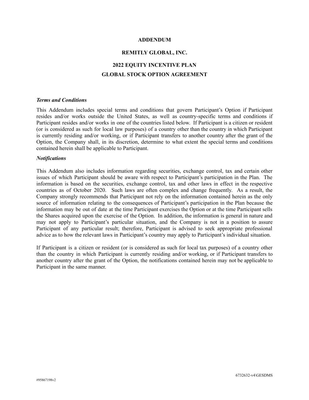 ADDENDUM REMITLY GLOBAL, INC. 2022 EQUITY INCENTIVE PLAN GLOBAL STOCK OPTION AGREEMENT Terms and Conditions This Addendum includes special terms and conditions that govern Participant’s Option if Participant resides and/or works outside the United States, as well as country-specific terms and conditions if Participant resides and/or works in one of the countries listed below. If Participant is a citizen or resident (or is considered as such for local law purposes) of a country other than the country in which Participant is currently residing and/or working, or if Participant transfers to another country after the grant of the Option, the Company shall, in its discretion, determine to what extent the special terms and conditions contained herein shall be applicable to Participant. Notifications This Addendum also includes information regarding securities, exchange control, tax and certain other issues of which Participant should be aware with respect to Participant’s participation in the Plan. The information is based on the securities, exchange control, tax and other laws in effect in the respective countries as of October 2020. Such laws are often complex and change frequently. As a result, the Company strongly recommends that Participant not rely on the information contained herein as the only source of information relating to the consequences of Participant’s participation in the Plan because the information may be out of date at the time Participant exercises the Option or at the time Participant sells the Shares acquired upon the exercise of the Option. In addition, the information is general in nature and may not apply to Participant’s particular situation, and the Company is not in a position to assure Participant of any particular result; therefore, Participant is advised to seek appropriate professional advice as to how the relevant laws in Participant’s country may apply to Participant’s individual situation. If Participant is a citizen or resident (or is considered as such for local tax purposes) of a country other than the country in which Participant is currently residing and/or working, or if Participant transfers to another country after the grant of the Option, the notifications contained herein may not be applicable to Participant in the same manner. 6732632-v4\GESDMS #95867198v2