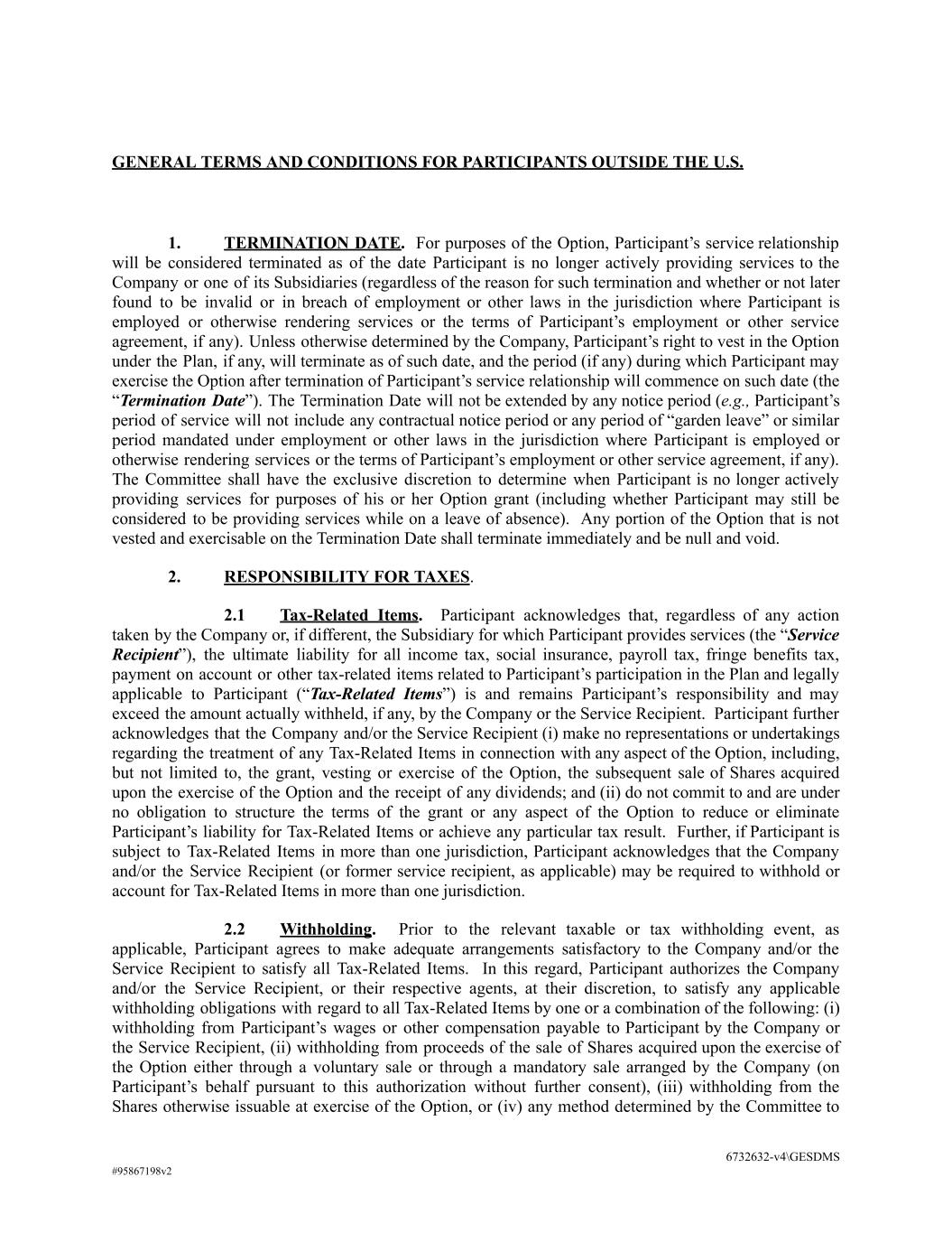 GENERAL TERMS AND CONDITIONS FOR PARTICIPANTS OUTSIDE THE U.S. 1. TERMINATION DATE. For purposes of the Option, Participant’s service relationship will be considered terminated as of the date Participant is no longer actively providing services to the Company or one of its Subsidiaries (regardless of the reason for such termination and whether or not later found to be invalid or in breach of employment or other laws in the jurisdiction where Participant is employed or otherwise rendering services or the terms of Participant’s employment or other service agreement, if any). Unless otherwise determined by the Company, Participant’s right to vest in the Option under the Plan, if any, will terminate as of such date, and the period (if any) during which Participant may exercise the Option after termination of Participant’s service relationship will commence on such date (the “Termination Date”). The Termination Date will not be extended by any notice period (e.g., Participant’s period of service will not include any contractual notice period or any period of “garden leave” or similar period mandated under employment or other laws in the jurisdiction where Participant is employed or otherwise rendering services or the terms of Participant’s employment or other service agreement, if any). The Committee shall have the exclusive discretion to determine when Participant is no longer actively providing services for purposes of his or her Option grant (including whether Participant may still be considered to be providing services while on a leave of absence). Any portion of the Option that is not vested and exercisable on the Termination Date shall terminate immediately and be null and void. 2. RESPONSIBILITY FOR TAXES. 2.1 Tax-Related Items. Participant acknowledges that, regardless of any action taken by the Company or, if different, the Subsidiary for which Participant provides services (the “Service Recipient”), the ultimate liability for all income tax, social insurance, payroll tax, fringe benefits tax, payment on account or other tax-related items related to Participant’s participation in the Plan and legally applicable to Participant (“Tax-Related Items”) is and remains Participant’s responsibility and may exceed the amount actually withheld, if any, by the Company or the Service Recipient. Participant further acknowledges that the Company and/or the Service Recipient (i) make no representations or undertakings regarding the treatment of any Tax-Related Items in connection with any aspect of the Option, including, but not limited to, the grant, vesting or exercise of the Option, the subsequent sale of Shares acquired upon the exercise of the Option and the receipt of any dividends; and (ii) do not commit to and are under no obligation to structure the terms of the grant or any aspect of the Option to reduce or eliminate Participant’s liability for Tax-Related Items or achieve any particular tax result. Further, if Participant is subject to Tax-Related Items in more than one jurisdiction, Participant acknowledges that the Company and/or the Service Recipient (or former service recipient, as applicable) may be required to withhold or account for Tax-Related Items in more than one jurisdiction. 2.2 Withholding. Prior to the relevant taxable or tax withholding event, as applicable, Participant agrees to make adequate arrangements satisfactory to the Company and/or the Service Recipient to satisfy all Tax-Related Items. In this regard, Participant authorizes the Company and/or the Service Recipient, or their respective agents, at their discretion, to satisfy any applicable withholding obligations with regard to all Tax-Related Items by one or a combination of the following: (i) withholding from Participant’s wages or other compensation payable to Participant by the Company or the Service Recipient, (ii) withholding from proceeds of the sale of Shares acquired upon the exercise of the Option either through a voluntary sale or through a mandatory sale arranged by the Company (on Participant’s behalf pursuant to this authorization without further consent), (iii) withholding from the Shares otherwise issuable at exercise of the Option, or (iv) any method determined by the Committee to 6732632-v4\GESDMS #95867198v2