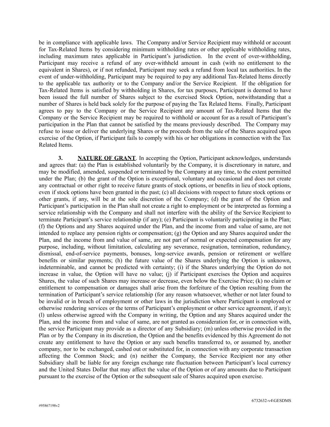be in compliance with applicable laws. The Company and/or Service Recipient may withhold or account for Tax-Related Items by considering minimum withholding rates or other applicable withholding rates, including maximum rates applicable in Participant’s jurisdiction. In the event of over-withholding, Participant may receive a refund of any over-withheld amount in cash (with no entitlement to the equivalent in Shares), or if not refunded, Participant may seek a refund from local tax authorities. In the event of under-withholding, Participant may be required to pay any additional Tax-Related Items directly to the applicable tax authority or to the Company and/or the Service Recipient. If the obligation for Tax-Related Items is satisfied by withholding in Shares, for tax purposes, Participant is deemed to have been issued the full number of Shares subject to the exercised Stock Option, notwithstanding that a number of Shares is held back solely for the purpose of paying the Tax Related Items. Finally, Participant agrees to pay to the Company or the Service Recipient any amount of Tax-Related Items that the Company or the Service Recipient may be required to withhold or account for as a result of Participant’s participation in the Plan that cannot be satisfied by the means previously described. The Company may refuse to issue or deliver the underlying Shares or the proceeds from the sale of the Shares acquired upon exercise of the Option, if Participant fails to comply with his or her obligations in connection with the Tax Related Items. 3. NATURE OF GRANT. In accepting the Option, Participant acknowledges, understands and agrees that: (a) the Plan is established voluntarily by the Company, it is discretionary in nature, and may be modified, amended, suspended or terminated by the Company at any time, to the extent permitted under the Plan; (b) the grant of the Option is exceptional, voluntary and occasional and does not create any contractual or other right to receive future grants of stock options, or benefits in lieu of stock options, even if stock options have been granted in the past; (c) all decisions with respect to future stock options or other grants, if any, will be at the sole discretion of the Company; (d) the grant of the Option and Participant’s participation in the Plan shall not create a right to employment or be interpreted as forming a service relationship with the Company and shall not interfere with the ability of the Service Recipient to terminate Participant’s service relationship (if any); (e) Participant is voluntarily participating in the Plan; (f) the Options and any Shares acquired under the Plan, and the income from and value of same, are not intended to replace any pension rights or compensation; (g) the Option and any Shares acquired under the Plan, and the income from and value of same, are not part of normal or expected compensation for any purpose, including, without limitation, calculating any severance, resignation, termination, redundancy, dismissal, end-of-service payments, bonuses, long-service awards, pension or retirement or welfare benefits or similar payments; (h) the future value of the Shares underlying the Option is unknown, indeterminable, and cannot be predicted with certainty; (i) if the Shares underlying the Option do not increase in value, the Option will have no value; (j) if Participant exercises the Option and acquires Shares, the value of such Shares may increase or decrease, even below the Exercise Price; (k) no claim or entitlement to compensation or damages shall arise from the forfeiture of the Option resulting from the termination of Participant’s service relationship (for any reason whatsoever, whether or not later found to be invalid or in breach of employment or other laws in the jurisdiction where Participant is employed or otherwise rendering services or the terms of Participant’s employment or other service agreement, if any); (l) unless otherwise agreed with the Company in writing, the Option and any Shares acquired under the Plan, and the income from and value of same, are not granted as consideration for, or in connection with, the service Participant may provide as a director of any Subsidiary; (m) unless otherwise provided in the Plan or by the Company in its discretion, the Option and the benefits evidenced by this Agreement do not create any entitlement to have the Option or any such benefits transferred to, or assumed by, another company, nor to be exchanged, cashed out or substituted for, in connection with any corporate transaction affecting the Common Stock; and (n) neither the Company, the Service Recipient nor any other Subsidiary shall be liable for any foreign exchange rate fluctuation between Participant’s local currency and the United States Dollar that may affect the value of the Option or of any amounts due to Participant pursuant to the exercise of the Option or the subsequent sale of Shares acquired upon exercise. 6732632-v4\GESDMS #95867198v2
