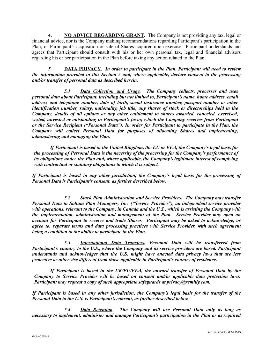 4. NO ADVICE REGARDING GRANT. The Company is not providing any tax, legal or financial advice, nor is the Company making recommendations regarding Participant’s participation in the Plan, or Participant’s acquisition or sale of Shares acquired upon exercise. Participant understands and agrees that Participant should consult with his or her own personal tax, legal and financial advisors regarding his or her participation in the Plan before taking any action related to the Plan. 5. DATA PRIVACY. In order to participate in the Plan, Participant will need to review the information provided in this Section 5 and, where applicable, declare consent to the processing and/or transfer of personal data as described herein. 5.1 Data Collection and Usage. The Company collects, processes and uses personal data about Participant, including but not limited to, Participant’s name, home address, email address and telephone number, date of birth, social insurance number, passport number or other identification number, salary, nationality, job title, any shares of stock or directorships held in the Company, details of all options or any other entitlement to shares awarded, canceled, exercised, vested, unvested or outstanding in Participant’s favor, which the Company receives from Participant or the Service Recipient (“Personal Data”). In order for Participant to participate in the Plan, the Company will collect Personal Data for purposes of allocating Shares and implementing, administering and managing the Plan. If Participant is based in the United Kingdom, the EU or EEA, the Company’s legal basis for the processing of Personal Data is the necessity of the processing for the Company's performance of its obligations under the Plan and, where applicable, the Company’s legitimate interest of complying with contractual or statutory obligations to which it is subject. If Participant is based in any other jurisdiction, the Company’s legal basis for the processing of Personal Data is Participant’s consent, as further described below. 5.2 Stock Plan Administration and Service Providers. The Company may transfer Personal Data to Solium Plan Managers, Inc. (“Service Provider”), an independent service provider with operations, relevant to the Company, in Canada and the U.S., which is assisting the Company with the implementation, administration and management of the Plan. Service Provider may open an account for Participant to receive and trade Shares. Participant may be asked to acknowledge, or agree to, separate terms and data processing practices with Service Provider, with such agreement being a condition to the ability to participate in the Plan. 5.3 International Data Transfers. Personal Data will be transferred from Participant’s country to the U.S., where the Company and its service providers are based. Participant understands and acknowledges that the U.S. might have enacted data privacy laws that are less protective or otherwise different from those applicable in Participant’s country of residence. If Participant is based in the UK/EU/EEA, the onward transfer of Personal Data by the Company to Service Provider will be based on consent and/or applicable data protection laws. Participant may request a copy of such appropriate safeguards at privacy@remitly.com. If Participant is based in any other jurisdiction, the Company’s legal basis for the transfer of the Personal Data to the U.S. is Participant’s consent, as further described below. 5.4 Data Retention. The Company will use Personal Data only as long as necessary to implement, administer and manage Participant’s participation in the Plan or as required 6732632-v4\GESDMS #95867198v2