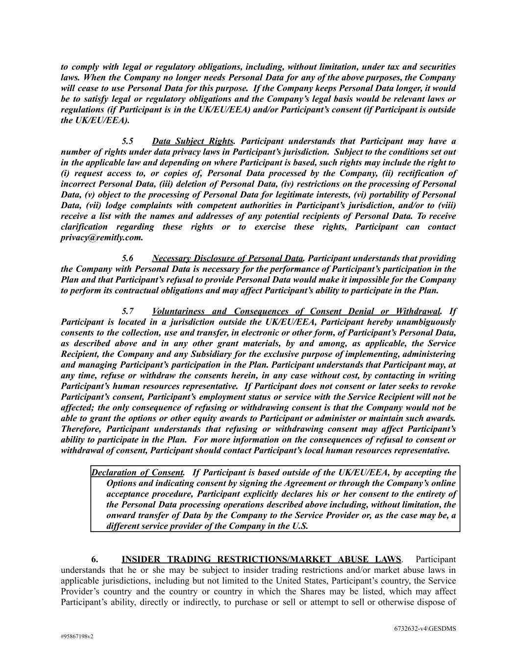 to comply with legal or regulatory obligations, including, without limitation, under tax and securities laws. When the Company no longer needs Personal Data for any of the above purposes, the Company will cease to use Personal Data for this purpose. If the Company keeps Personal Data longer, it would be to satisfy legal or regulatory obligations and the Company’s legal basis would be relevant laws or regulations (if Participant is in the UK/EU/EEA) and/or Participant’s consent (if Participant is outside the UK/EU/EEA). 5.5 Data Subject Rights. Participant understands that Participant may have a number of rights under data privacy laws in Participant’s jurisdiction. Subject to the conditions set out in the applicable law and depending on where Participant is based, such rights may include the right to (i) request access to, or copies of, Personal Data processed by the Company, (ii) rectification of incorrect Personal Data, (iii) deletion of Personal Data, (iv) restrictions on the processing of Personal Data, (v) object to the processing of Personal Data for legitimate interests, (vi) portability of Personal Data, (vii) lodge complaints with competent authorities in Participant’s jurisdiction, and/or to (viii) receive a list with the names and addresses of any potential recipients of Personal Data. To receive clarification regarding these rights or to exercise these rights, Participant can contact privacy@remitly.com. 5.6 Necessary Disclosure of Personal Data. Participant understands that providing the Company with Personal Data is necessary for the performance of Participant’s participation in the Plan and that Participant’s refusal to provide Personal Data would make it impossible for the Company to perform its contractual obligations and may affect Participant’s ability to participate in the Plan. 5.7 Voluntariness and Consequences of Consent Denial or Withdrawal. If Participant is located in a jurisdiction outside the UK/EU/EEA, Participant hereby unambiguously consents to the collection, use and transfer, in electronic or other form, of Participant’s Personal Data, as described above and in any other grant materials, by and among, as applicable, the Service Recipient, the Company and any Subsidiary for the exclusive purpose of implementing, administering and managing Participant’s participation in the Plan. Participant understands that Participant may, at any time, refuse or withdraw the consents herein, in any case without cost, by contacting in writing Participant’s human resources representative. If Participant does not consent or later seeks to revoke Participant’s consent, Participant’s employment status or service with the Service Recipient will not be affected; the only consequence of refusing or withdrawing consent is that the Company would not be able to grant the options or other equity awards to Participant or administer or maintain such awards. Therefore, Participant understands that refusing or withdrawing consent may affect Participant’s ability to participate in the Plan. For more information on the consequences of refusal to consent or withdrawal of consent, Participant should contact Participant’s local human resources representative. Declaration of Consent. If Participant is based outside of the UK/EU/EEA, by accepting the Options and indicating consent by signing the Agreement or through the Company’s online acceptance procedure, Participant explicitly declares his or her consent to the entirety of the Personal Data processing operations described above including, without limitation, the onward transfer of Data by the Company to the Service Provider or, as the case may be, a different service provider of the Company in the U.S. 6. INSIDER TRADING RESTRICTIONS/MARKET ABUSE LAWS. Participant understands that he or she may be subject to insider trading restrictions and/or market abuse laws in applicable jurisdictions, including but not limited to the United States, Participant’s country, the Service Provider’s country and the country or country in which the Shares may be listed, which may affect Participant’s ability, directly or indirectly, to purchase or sell or attempt to sell or otherwise dispose of 6732632-v4\GESDMS #95867198v2