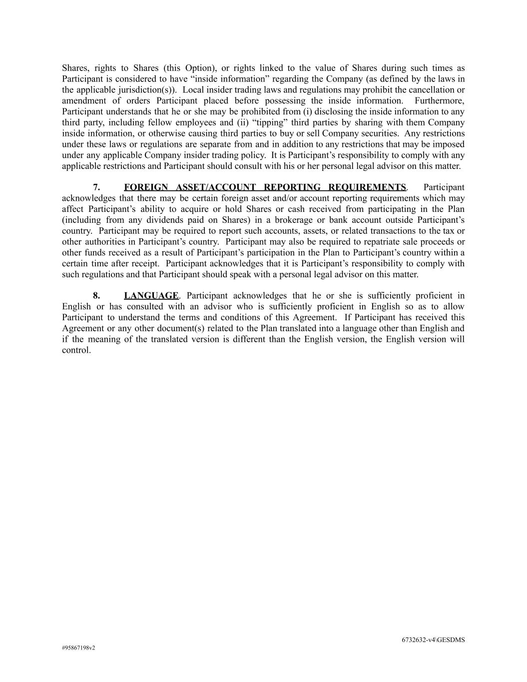Shares, rights to Shares (this Option), or rights linked to the value of Shares during such times as Participant is considered to have “inside information” regarding the Company (as defined by the laws in the applicable jurisdiction(s)). Local insider trading laws and regulations may prohibit the cancellation or amendment of orders Participant placed before possessing the inside information. Furthermore, Participant understands that he or she may be prohibited from (i) disclosing the inside information to any third party, including fellow employees and (ii) “tipping” third parties by sharing with them Company inside information, or otherwise causing third parties to buy or sell Company securities. Any restrictions under these laws or regulations are separate from and in addition to any restrictions that may be imposed under any applicable Company insider trading policy. It is Participant’s responsibility to comply with any applicable restrictions and Participant should consult with his or her personal legal advisor on this matter. 7. FOREIGN ASSET/ACCOUNT REPORTING REQUIREMENTS. Participant acknowledges that there may be certain foreign asset and/or account reporting requirements which may affect Participant’s ability to acquire or hold Shares or cash received from participating in the Plan (including from any dividends paid on Shares) in a brokerage or bank account outside Participant’s country. Participant may be required to report such accounts, assets, or related transactions to the tax or other authorities in Participant’s country. Participant may also be required to repatriate sale proceeds or other funds received as a result of Participant’s participation in the Plan to Participant’s country within a certain time after receipt. Participant acknowledges that it is Participant’s responsibility to comply with such regulations and that Participant should speak with a personal legal advisor on this matter. 8. LANGUAGE. Participant acknowledges that he or she is sufficiently proficient in English or has consulted with an advisor who is sufficiently proficient in English so as to allow Participant to understand the terms and conditions of this Agreement. If Participant has received this Agreement or any other document(s) related to the Plan translated into a language other than English and if the meaning of the translated version is different than the English version, the English version will control. 6732632-v4\GESDMS #95867198v2