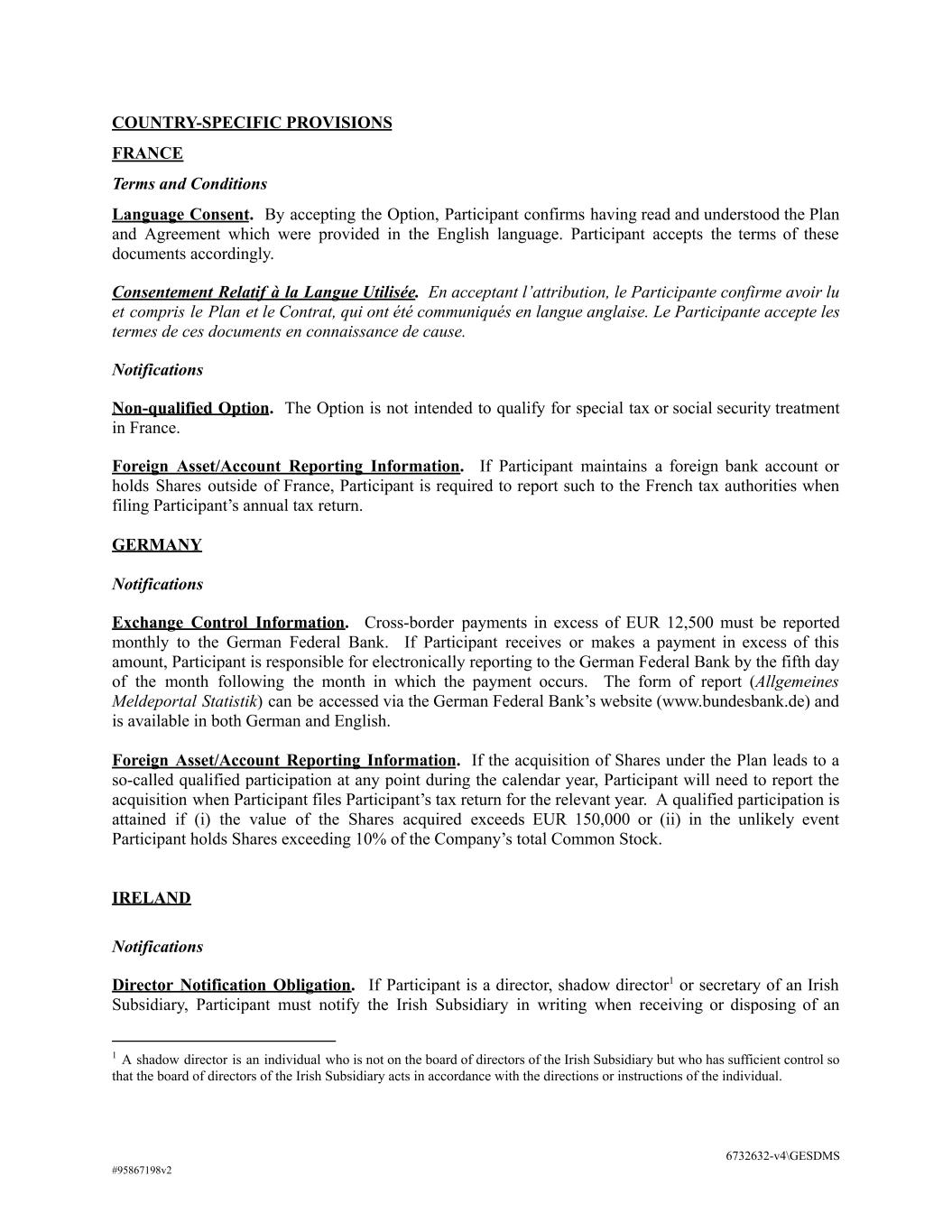 COUNTRY-SPECIFIC PROVISIONS FRANCE Terms and Conditions Language Consent. By accepting the Option, Participant confirms having read and understood the Plan and Agreement which were provided in the English language. Participant accepts the terms of these documents accordingly. Consentement Relatif à la Langue Utilisée. En acceptant l’attribution, le Participante confirme avoir lu et compris le Plan et le Contrat, qui ont été communiqués en langue anglaise. Le Participante accepte les termes de ces documents en connaissance de cause. Notifications Non-qualified Option. The Option is not intended to qualify for special tax or social security treatment in France. Foreign Asset/Account Reporting Information. If Participant maintains a foreign bank account or holds Shares outside of France, Participant is required to report such to the French tax authorities when filing Participant’s annual tax return. GERMANY Notifications Exchange Control Information. Cross-border payments in excess of EUR 12,500 must be reported monthly to the German Federal Bank. If Participant receives or makes a payment in excess of this amount, Participant is responsible for electronically reporting to the German Federal Bank by the fifth day of the month following the month in which the payment occurs. The form of report (Allgemeines Meldeportal Statistik) can be accessed via the German Federal Bank’s website (www.bundesbank.de) and is available in both German and English. Foreign Asset/Account Reporting Information. If the acquisition of Shares under the Plan leads to a so-called qualified participation at any point during the calendar year, Participant will need to report the acquisition when Participant files Participant’s tax return for the relevant year. A qualified participation is attained if (i) the value of the Shares acquired exceeds EUR 150,000 or (ii) in the unlikely event Participant holds Shares exceeding 10% of the Company’s total Common Stock. IRELAND Notifications Director Notification Obligation. If Participant is a director, shadow director1 or secretary of an Irish Subsidiary, Participant must notify the Irish Subsidiary in writing when receiving or disposing of an 1 A shadow director is an individual who is not on the board of directors of the Irish Subsidiary but who has sufficient control so that the board of directors of the Irish Subsidiary acts in accordance with the directions or instructions of the individual. 6732632-v4\GESDMS #95867198v2
