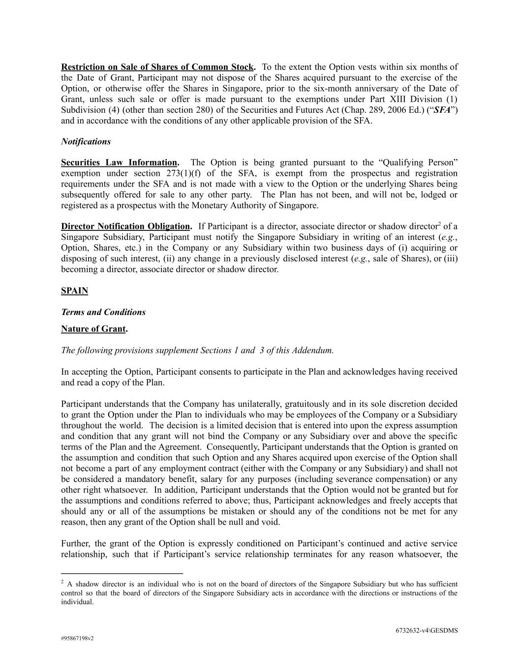 Restriction on Sale of Shares of Common Stock. To the extent the Option vests within six months of the Date of Grant, Participant may not dispose of the Shares acquired pursuant to the exercise of the Option, or otherwise offer the Shares in Singapore, prior to the six-month anniversary of the Date of Grant, unless such sale or offer is made pursuant to the exemptions under Part XIII Division (1) Subdivision (4) (other than section 280) of the Securities and Futures Act (Chap. 289, 2006 Ed.) (“SFA”) and in accordance with the conditions of any other applicable provision of the SFA. Notifications Securities Law Information. The Option is being granted pursuant to the “Qualifying Person” exemption under section 273(1)(f) of the SFA, is exempt from the prospectus and registration requirements under the SFA and is not made with a view to the Option or the underlying Shares being subsequently offered for sale to any other party. The Plan has not been, and will not be, lodged or registered as a prospectus with the Monetary Authority of Singapore. Director Notification Obligation. If Participant is a director, associate director or shadow director2 of a Singapore Subsidiary, Participant must notify the Singapore Subsidiary in writing of an interest (e.g., Option, Shares, etc.) in the Company or any Subsidiary within two business days of (i) acquiring or disposing of such interest, (ii) any change in a previously disclosed interest (e.g., sale of Shares), or (iii) becoming a director, associate director or shadow director. SPAIN Terms and Conditions Nature of Grant. The following provisions supplement Sections 1 and 3 of this Addendum. In accepting the Option, Participant consents to participate in the Plan and acknowledges having received and read a copy of the Plan. Participant understands that the Company has unilaterally, gratuitously and in its sole discretion decided to grant the Option under the Plan to individuals who may be employees of the Company or a Subsidiary throughout the world. The decision is a limited decision that is entered into upon the express assumption and condition that any grant will not bind the Company or any Subsidiary over and above the specific terms of the Plan and the Agreement. Consequently, Participant understands that the Option is granted on the assumption and condition that such Option and any Shares acquired upon exercise of the Option shall not become a part of any employment contract (either with the Company or any Subsidiary) and shall not be considered a mandatory benefit, salary for any purposes (including severance compensation) or any other right whatsoever. In addition, Participant understands that the Option would not be granted but for the assumptions and conditions referred to above; thus, Participant acknowledges and freely accepts that should any or all of the assumptions be mistaken or should any of the conditions not be met for any reason, then any grant of the Option shall be null and void. Further, the grant of the Option is expressly conditioned on Participant’s continued and active service relationship, such that if Participant’s service relationship terminates for any reason whatsoever, the 2 A shadow director is an individual who is not on the board of directors of the Singapore Subsidiary but who has sufficient control so that the board of directors of the Singapore Subsidiary acts in accordance with the directions or instructions of the individual. 6732632-v4\GESDMS #95867198v2