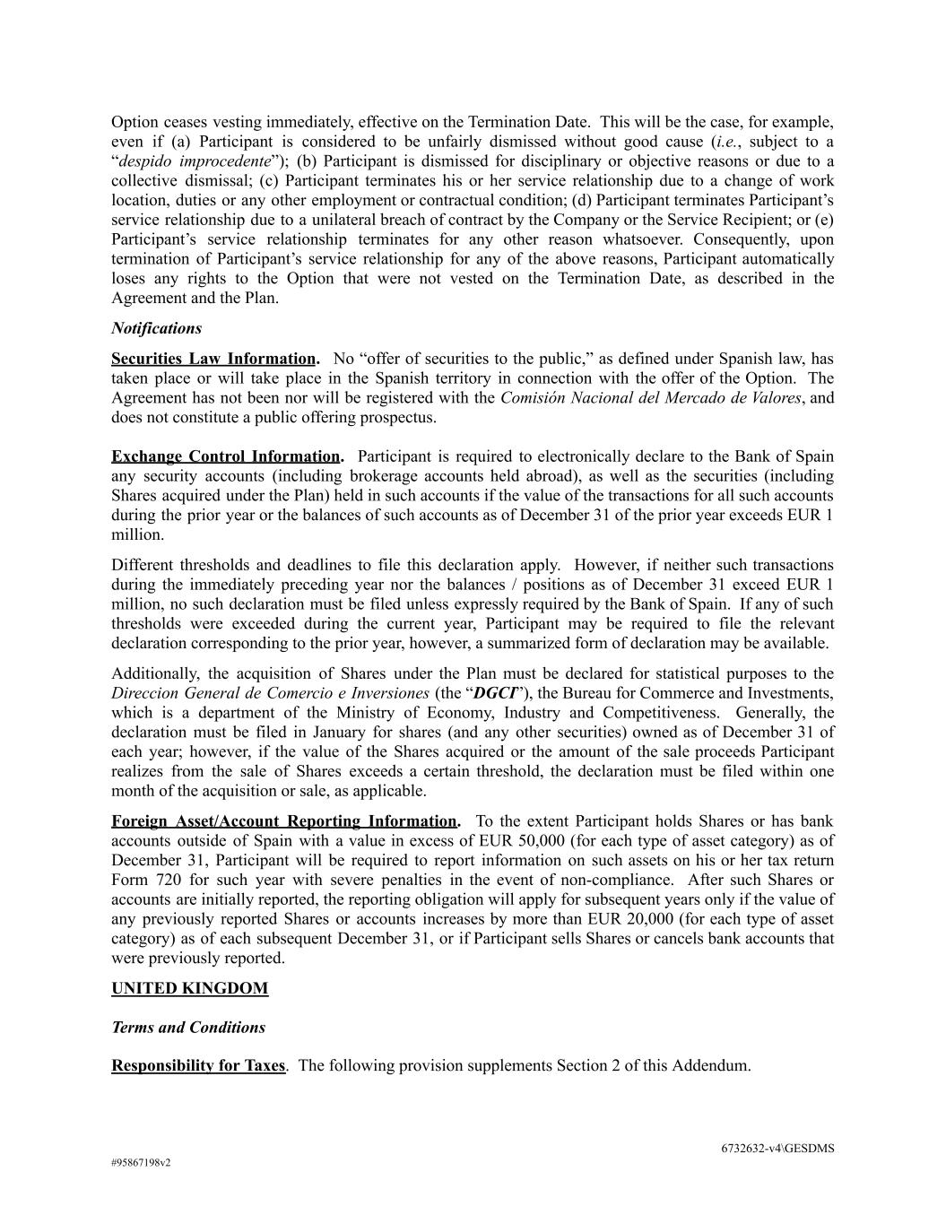 Option ceases vesting immediately, effective on the Termination Date. This will be the case, for example, even if (a) Participant is considered to be unfairly dismissed without good cause (i.e., subject to a “despido improcedente”); (b) Participant is dismissed for disciplinary or objective reasons or due to a collective dismissal; (c) Participant terminates his or her service relationship due to a change of work location, duties or any other employment or contractual condition; (d) Participant terminates Participant’s service relationship due to a unilateral breach of contract by the Company or the Service Recipient; or (e) Participant’s service relationship terminates for any other reason whatsoever. Consequently, upon termination of Participant’s service relationship for any of the above reasons, Participant automatically loses any rights to the Option that were not vested on the Termination Date, as described in the Agreement and the Plan. Notifications Securities Law Information. No “offer of securities to the public,” as defined under Spanish law, has taken place or will take place in the Spanish territory in connection with the offer of the Option. The Agreement has not been nor will be registered with the Comisión Nacional del Mercado de Valores, and does not constitute a public offering prospectus. Exchange Control Information. Participant is required to electronically declare to the Bank of Spain any security accounts (including brokerage accounts held abroad), as well as the securities (including Shares acquired under the Plan) held in such accounts if the value of the transactions for all such accounts during the prior year or the balances of such accounts as of December 31 of the prior year exceeds EUR 1 million. Different thresholds and deadlines to file this declaration apply. However, if neither such transactions during the immediately preceding year nor the balances / positions as of December 31 exceed EUR 1 million, no such declaration must be filed unless expressly required by the Bank of Spain. If any of such thresholds were exceeded during the current year, Participant may be required to file the relevant declaration corresponding to the prior year, however, a summarized form of declaration may be available. Additionally, the acquisition of Shares under the Plan must be declared for statistical purposes to the Direccion General de Comercio e Inversiones (the “DGCI”), the Bureau for Commerce and Investments, which is a department of the Ministry of Economy, Industry and Competitiveness. Generally, the declaration must be filed in January for shares (and any other securities) owned as of December 31 of each year; however, if the value of the Shares acquired or the amount of the sale proceeds Participant realizes from the sale of Shares exceeds a certain threshold, the declaration must be filed within one month of the acquisition or sale, as applicable. Foreign Asset/Account Reporting Information. To the extent Participant holds Shares or has bank accounts outside of Spain with a value in excess of EUR 50,000 (for each type of asset category) as of December 31, Participant will be required to report information on such assets on his or her tax return Form 720 for such year with severe penalties in the event of non-compliance. After such Shares or accounts are initially reported, the reporting obligation will apply for subsequent years only if the value of any previously reported Shares or accounts increases by more than EUR 20,000 (for each type of asset category) as of each subsequent December 31, or if Participant sells Shares or cancels bank accounts that were previously reported. UNITED KINGDOM Terms and Conditions Responsibility for Taxes. The following provision supplements Section 2 of this Addendum. 6732632-v4\GESDMS #95867198v2