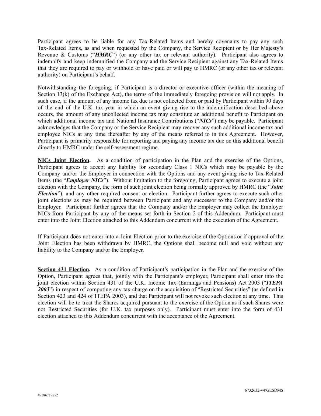 Participant agrees to be liable for any Tax-Related Items and hereby covenants to pay any such Tax-Related Items, as and when requested by the Company, the Service Recipient or by Her Majesty’s Revenue & Customs (“HMRC”) (or any other tax or relevant authority). Participant also agrees to indemnify and keep indemnified the Company and the Service Recipient against any Tax-Related Items that they are required to pay or withhold or have paid or will pay to HMRC (or any other tax or relevant authority) on Participant’s behalf. Notwithstanding the foregoing, if Participant is a director or executive officer (within the meaning of Section 13(k) of the Exchange Act), the terms of the immediately foregoing provision will not apply. In such case, if the amount of any income tax due is not collected from or paid by Participant within 90 days of the end of the U.K. tax year in which an event giving rise to the indemnification described above occurs, the amount of any uncollected income tax may constitute an additional benefit to Participant on which additional income tax and National Insurance Contributions (“NICs”) may be payable. Participant acknowledges that the Company or the Service Recipient may recover any such additional income tax and employee NICs at any time thereafter by any of the means referred to in this Agreement. However, Participant is primarily responsible for reporting and paying any income tax due on this additional benefit directly to HMRC under the self-assessment regime. NICs Joint Election. As a condition of participation in the Plan and the exercise of the Options, Participant agrees to accept any liability for secondary Class 1 NICs which may be payable by the Company and/or the Employer in connection with the Options and any event giving rise to Tax-Related Items (the “Employer NICs”). Without limitation to the foregoing, Participant agrees to execute a joint election with the Company, the form of such joint election being formally approved by HMRC (the “Joint Election”), and any other required consent or election. Participant further agrees to execute such other joint elections as may be required between Participant and any successor to the Company and/or the Employer. Participant further agrees that the Company and/or the Employer may collect the Employer NICs from Participant by any of the means set forth in Section 2 of this Addendum. Participant must enter into the Joint Election attached to this Addendum concurrent with the execution of the Agreement. If Participant does not enter into a Joint Election prior to the exercise of the Options or if approval of the Joint Election has been withdrawn by HMRC, the Options shall become null and void without any liability to the Company and/or the Employer. Section 431 Election. As a condition of Participant’s participation in the Plan and the exercise of the Option, Participant agrees that, jointly with the Participant’s employer, Participant shall enter into the joint election within Section 431 of the U.K. Income Tax (Earnings and Pensions) Act 2003 (“ITEPA 2003”) in respect of computing any tax charge on the acquisition of “Restricted Securities” (as defined in Section 423 and 424 of ITEPA 2003), and that Participant will not revoke such election at any time. This election will be to treat the Shares acquired pursuant to the exercise of the Option as if such Shares were not Restricted Securities (for U.K. tax purposes only). Participant must enter into the form of 431 election attached to this Addendum concurrent with the acceptance of the Agreement. 6732632-v4\GESDMS #95867198v2