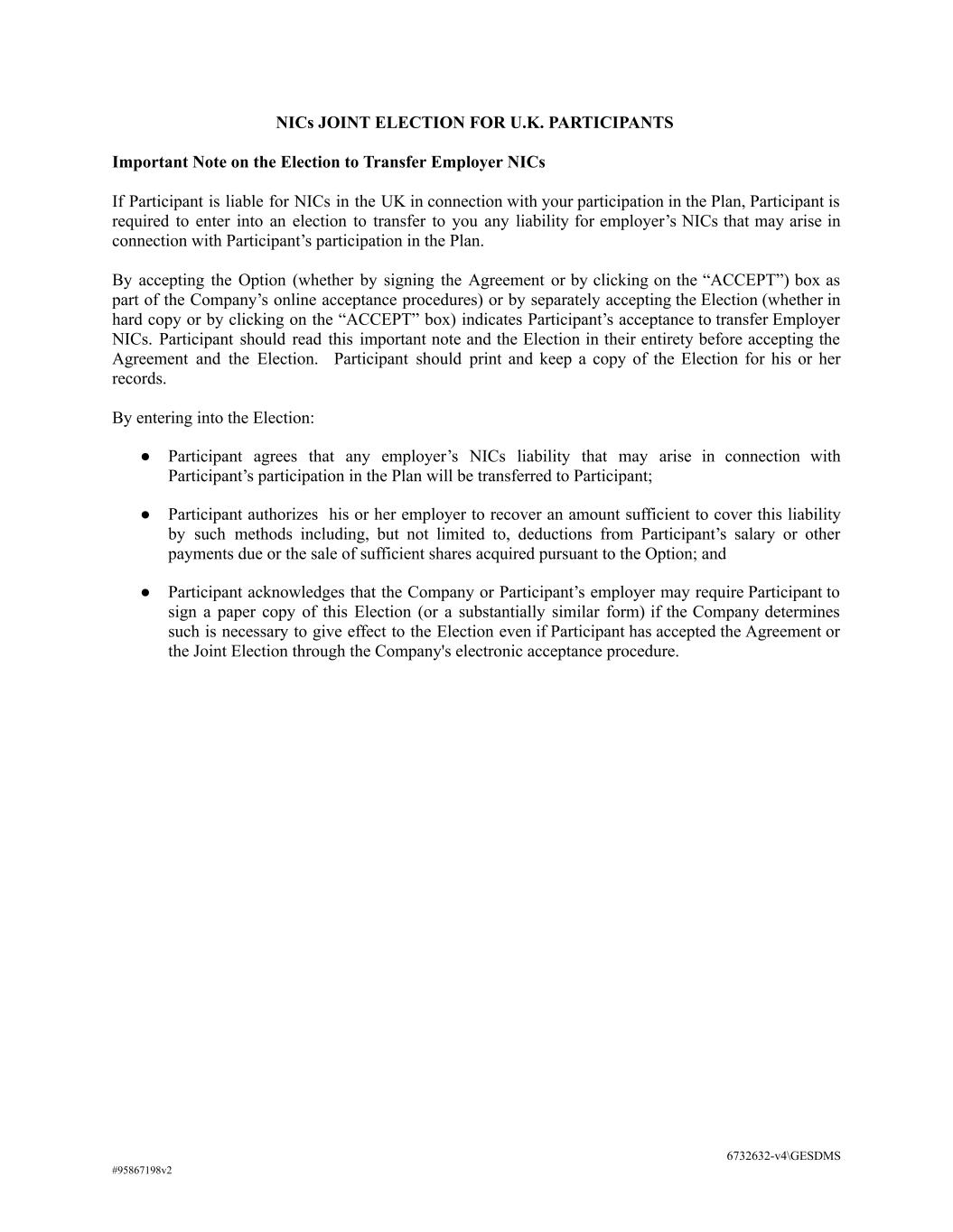 NICs JOINT ELECTION FOR U.K. PARTICIPANTS Important Note on the Election to Transfer Employer NICs If Participant is liable for NICs in the UK in connection with your participation in the Plan, Participant is required to enter into an election to transfer to you any liability for employer’s NICs that may arise in connection with Participant’s participation in the Plan. By accepting the Option (whether by signing the Agreement or by clicking on the “ACCEPT”) box as part of the Company’s online acceptance procedures) or by separately accepting the Election (whether in hard copy or by clicking on the “ACCEPT” box) indicates Participant’s acceptance to transfer Employer NICs. Participant should read this important note and the Election in their entirety before accepting the Agreement and the Election. Participant should print and keep a copy of the Election for his or her records. By entering into the Election: ● Participant agrees that any employer’s NICs liability that may arise in connection with Participant’s participation in the Plan will be transferred to Participant; ● Participant authorizes his or her employer to recover an amount sufficient to cover this liability by such methods including, but not limited to, deductions from Participant’s salary or other payments due or the sale of sufficient shares acquired pursuant to the Option; and ● Participant acknowledges that the Company or Participant’s employer may require Participant to sign a paper copy of this Election (or a substantially similar form) if the Company determines such is necessary to give effect to the Election even if Participant has accepted the Agreement or the Joint Election through the Company's electronic acceptance procedure. 6732632-v4\GESDMS #95867198v2