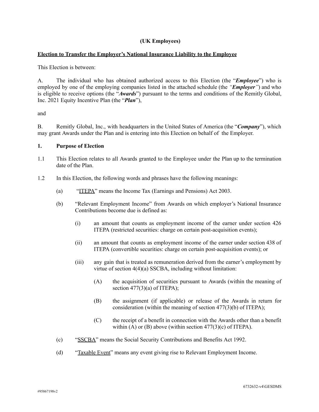 (UK Employees) Election to Transfer the Employer’s National Insurance Liability to the Employee This Election is between: A. The individual who has obtained authorized access to this Election (the “Employee”) who is employed by one of the employing companies listed in the attached schedule (the “Employer”) and who is eligible to receive options (the “Awards”) pursuant to the terms and conditions of the Remitly Global, Inc. 2021 Equity Incentive Plan (the “Plan”), and B. Remitly Global, Inc., with headquarters in the United States of America (the “Company”), which may grant Awards under the Plan and is entering into this Election on behalf of the Employer. 1. Purpose of Election 1.1 This Election relates to all Awards granted to the Employee under the Plan up to the termination date of the Plan. 1.2 In this Election, the following words and phrases have the following meanings: (a) “ITEPA” means the Income Tax (Earnings and Pensions) Act 2003. (b) “Relevant Employment Income” from Awards on which employer’s National Insurance Contributions become due is defined as: (i) an amount that counts as employment income of the earner under section 426 ITEPA (restricted securities: charge on certain post-acquisition events); (ii) an amount that counts as employment income of the earner under section 438 of ITEPA (convertible securities: charge on certain post-acquisition events); or (iii) any gain that is treated as remuneration derived from the earner’s employment by virtue of section 4(4)(a) SSCBA, including without limitation: (A) the acquisition of securities pursuant to Awards (within the meaning of section 477(3)(a) of ITEPA); (B) the assignment (if applicable) or release of the Awards in return for consideration (within the meaning of section 477(3)(b) of ITEPA); (C) the receipt of a benefit in connection with the Awards other than a benefit within (A) or (B) above (within section 477(3)(c) of ITEPA). (c) “SSCBA” means the Social Security Contributions and Benefits Act 1992. (d) “Taxable Event” means any event giving rise to Relevant Employment Income. 6732632-v4\GESDMS #95867198v2