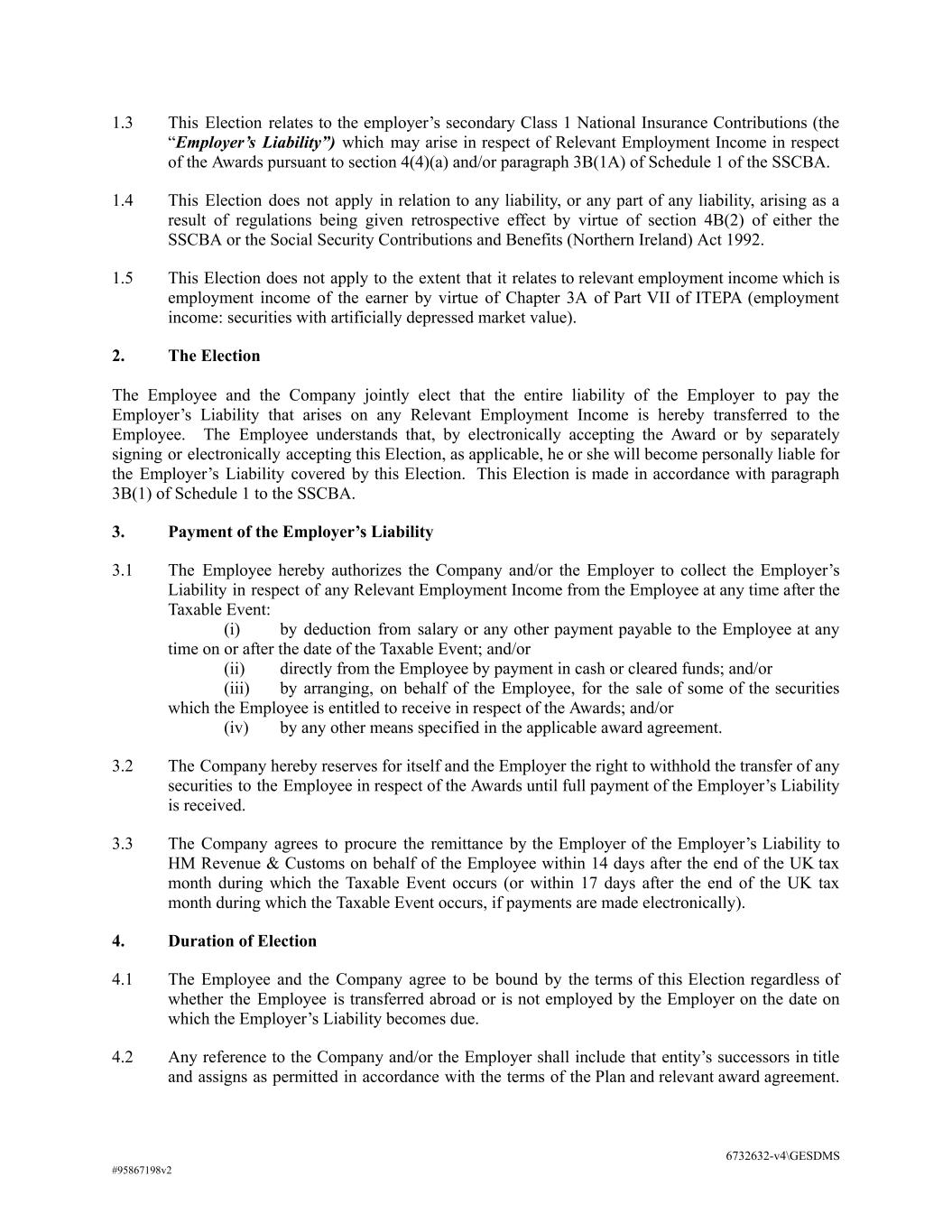 1.3 This Election relates to the employer’s secondary Class 1 National Insurance Contributions (the “Employer’s Liability”) which may arise in respect of Relevant Employment Income in respect of the Awards pursuant to section 4(4)(a) and/or paragraph 3B(1A) of Schedule 1 of the SSCBA. 1.4 This Election does not apply in relation to any liability, or any part of any liability, arising as a result of regulations being given retrospective effect by virtue of section 4B(2) of either the SSCBA or the Social Security Contributions and Benefits (Northern Ireland) Act 1992. 1.5 This Election does not apply to the extent that it relates to relevant employment income which is employment income of the earner by virtue of Chapter 3A of Part VII of ITEPA (employment income: securities with artificially depressed market value). 2. The Election The Employee and the Company jointly elect that the entire liability of the Employer to pay the Employer’s Liability that arises on any Relevant Employment Income is hereby transferred to the Employee. The Employee understands that, by electronically accepting the Award or by separately signing or electronically accepting this Election, as applicable, he or she will become personally liable for the Employer’s Liability covered by this Election. This Election is made in accordance with paragraph 3B(1) of Schedule 1 to the SSCBA. 3. Payment of the Employer’s Liability 3.1 The Employee hereby authorizes the Company and/or the Employer to collect the Employer’s Liability in respect of any Relevant Employment Income from the Employee at any time after the Taxable Event: (i) by deduction from salary or any other payment payable to the Employee at any time on or after the date of the Taxable Event; and/or (ii) directly from the Employee by payment in cash or cleared funds; and/or (iii) by arranging, on behalf of the Employee, for the sale of some of the securities which the Employee is entitled to receive in respect of the Awards; and/or (iv) by any other means specified in the applicable award agreement. 3.2 The Company hereby reserves for itself and the Employer the right to withhold the transfer of any securities to the Employee in respect of the Awards until full payment of the Employer’s Liability is received. 3.3 The Company agrees to procure the remittance by the Employer of the Employer’s Liability to HM Revenue & Customs on behalf of the Employee within 14 days after the end of the UK tax month during which the Taxable Event occurs (or within 17 days after the end of the UK tax month during which the Taxable Event occurs, if payments are made electronically). 4. Duration of Election 4.1 The Employee and the Company agree to be bound by the terms of this Election regardless of whether the Employee is transferred abroad or is not employed by the Employer on the date on which the Employer’s Liability becomes due. 4.2 Any reference to the Company and/or the Employer shall include that entity’s successors in title and assigns as permitted in accordance with the terms of the Plan and relevant award agreement. 6732632-v4\GESDMS #95867198v2