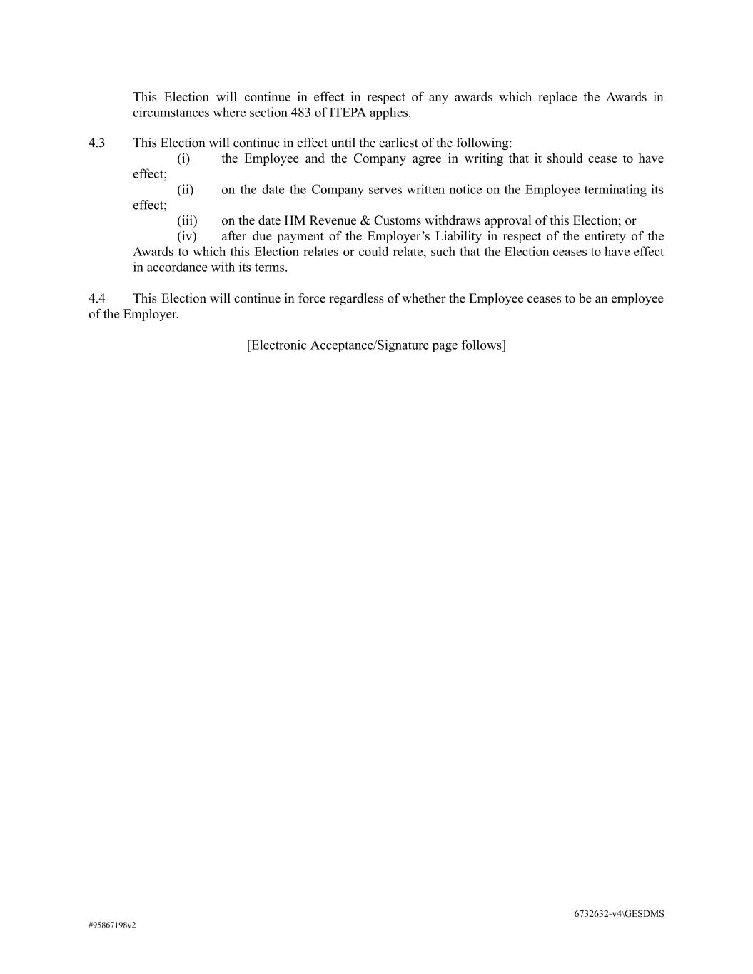 This Election will continue in effect in respect of any awards which replace the Awards in circumstances where section 483 of ITEPA applies. 4.3 This Election will continue in effect until the earliest of the following: (i) the Employee and the Company agree in writing that it should cease to have effect; (ii) on the date the Company serves written notice on the Employee terminating its effect; (iii) on the date HM Revenue & Customs withdraws approval of this Election; or (iv) after due payment of the Employer’s Liability in respect of the entirety of the Awards to which this Election relates or could relate, such that the Election ceases to have effect in accordance with its terms. 4.4 This Election will continue in force regardless of whether the Employee ceases to be an employee of the Employer. [Electronic Acceptance/Signature page follows] 6732632-v4\GESDMS #95867198v2