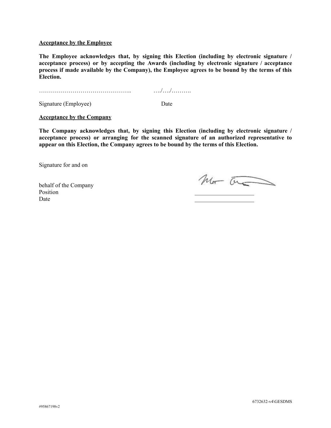 Acceptance by the Employee The Employee acknowledges that, by signing this Election (including by electronic signature / acceptance process) or by accepting the Awards (including by electronic signature / acceptance process if made available by the Company), the Employee agrees to be bound by the terms of this Election. ……………………………………….. …./…./………. Signature (Employee) Date Acceptance by the Company The Company acknowledges that, by signing this Election (including by electronic signature / acceptance process) or arranging for the scanned signature of an authorized representative to appear on this Election, the Company agrees to be bound by the terms of this Election. Signature for and on behalf of the Company Position ____________________ Date ____________________ 6732632-v4\GESDMS #95867198v2