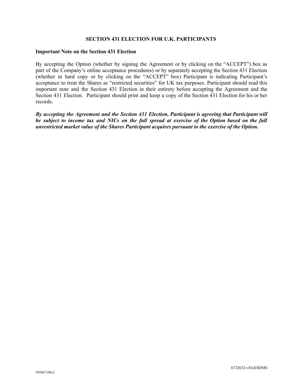 SECTION 431 ELECTION FOR U.K. PARTICIPANTS Important Note on the Section 431 Election By accepting the Option (whether by signing the Agreement or by clicking on the “ACCEPT”) box as part of the Company’s online acceptance procedures) or by separately accepting the Section 431 Election (whether in hard copy or by clicking on the “ACCEPT” box) Participant is indicating Participant’s acceptance to treat the Shares as “restricted securities” for UK tax purposes. Participant should read this important note and the Section 431 Election in their entirety before accepting the Agreement and the Section 431 Election. Participant should print and keep a copy of the Section 431 Election for his or her records. By accepting the Agreement and the Section 431 Election, Participant is agreeing that Participant will be subject to income tax and NICs on the full spread at exercise of the Option based on the full unrestricted market value of the Shares Participant acquires pursuant to the exercise of the Option. 6732632-v4\GESDMS #95867198v2