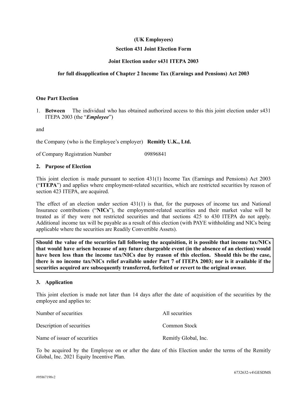 (UK Employees) Section 431 Joint Election Form Joint Election under s431 ITEPA 2003 for full disapplication of Chapter 2 Income Tax (Earnings and Pensions) Act 2003 One Part Election 1. Between The individual who has obtained authorized access to this this joint election under s431 ITEPA 2003 (the “Employee”) and the Company (who is the Employee’s employer) Remitly U.K., Ltd. of Company Registration Number 09896841 2. Purpose of Election This joint election is made pursuant to section 431(1) Income Tax (Earnings and Pensions) Act 2003 (“ITEPA”) and applies where employment-related securities, which are restricted securities by reason of section 423 ITEPA, are acquired. The effect of an election under section 431(1) is that, for the purposes of income tax and National Insurance contributions (“NICs”), the employment-related securities and their market value will be treated as if they were not restricted securities and that sections 425 to 430 ITEPA do not apply. Additional income tax will be payable as a result of this election (with PAYE withholding and NICs being applicable where the securities are Readily Convertible Assets). Should the value of the securities fall following the acquisition, it is possible that income tax/NICs that would have arisen because of any future chargeable event (in the absence of an election) would have been less than the income tax/NICs due by reason of this election. Should this be the case, there is no income tax/NICs relief available under Part 7 of ITEPA 2003; nor is it available if the securities acquired are subsequently transferred, forfeited or revert to the original owner. 3. Application This joint election is made not later than 14 days after the date of acquisition of the securities by the employee and applies to: Number of securities All securities Description of securities Common Stock Name of issuer of securities Remitly Global, Inc. To be acquired by the Employee on or after the date of this Election under the terms of the Remitly Global, Inc. 2021 Equity Incentive Plan. 6732632-v4\GESDMS #95867198v2