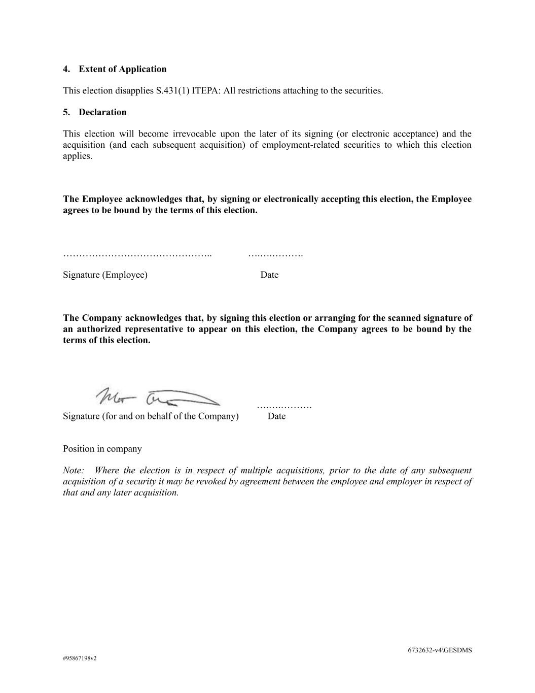 4. Extent of Application This election disapplies S.431(1) ITEPA: All restrictions attaching to the securities. 5. Declaration This election will become irrevocable upon the later of its signing (or electronic acceptance) and the acquisition (and each subsequent acquisition) of employment-related securities to which this election applies. The Employee acknowledges that, by signing or electronically accepting this election, the Employee agrees to be bound by the terms of this election. ……………………………………….. ….….………. Signature (Employee) Date The Company acknowledges that, by signing this election or arranging for the scanned signature of an authorized representative to appear on this election, the Company agrees to be bound by the terms of this election. ….….………. Signature (for and on behalf of the Company) Date Position in company Note: Where the election is in respect of multiple acquisitions, prior to the date of any subsequent acquisition of a security it may be revoked by agreement between the employee and employer in respect of that and any later acquisition. 6732632-v4\GESDMS #95867198v2