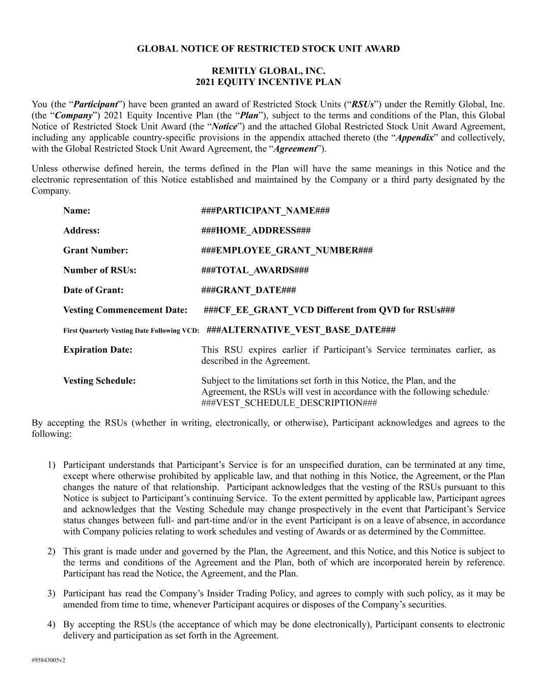 GLOBAL NOTICE OF RESTRICTED STOCK UNIT AWARD REMITLY GLOBAL, INC. 2021 EQUITY INCENTIVE PLAN You (the “Participant”) have been granted an award of Restricted Stock Units (“RSUs”) under the Remitly Global, Inc. (the “Company”) 2021 Equity Incentive Plan (the “Plan”), subject to the terms and conditions of the Plan, this Global Notice of Restricted Stock Unit Award (the “Notice”) and the attached Global Restricted Stock Unit Award Agreement, including any applicable country-specific provisions in the appendix attached thereto (the “Appendix” and collectively, with the Global Restricted Stock Unit Award Agreement, the “Agreement”). Unless otherwise defined herein, the terms defined in the Plan will have the same meanings in this Notice and the electronic representation of this Notice established and maintained by the Company or a third party designated by the Company. Name: ###PARTICIPANT_NAME### Address: ###HOME_ADDRESS### Grant Number: ###EMPLOYEE_GRANT_NUMBER### Number of RSUs: ###TOTAL_AWARDS### Date of Grant: ###GRANT_DATE### Vesting Commencement Date: ###CF_EE_GRANT_VCD Different from QVD for RSUs### First Quarterly Vesting Date Following VCD: ###ALTERNATIVE_VEST_BASE_DATE### Expiration Date: This RSU expires earlier if Participant’s Service terminates earlier, as described in the Agreement. Vesting Schedule: Subject to the limitations set forth in this Notice, the Plan, and the Agreement, the RSUs will vest in accordance with the following schedule: ###VEST_SCHEDULE_DESCRIPTION### By accepting the RSUs (whether in writing, electronically, or otherwise), Participant acknowledges and agrees to the following: 1) Participant understands that Participant’s Service is for an unspecified duration, can be terminated at any time, except where otherwise prohibited by applicable law, and that nothing in this Notice, the Agreement, or the Plan changes the nature of that relationship. Participant acknowledges that the vesting of the RSUs pursuant to this Notice is subject to Participant’s continuing Service. To the extent permitted by applicable law, Participant agrees and acknowledges that the Vesting Schedule may change prospectively in the event that Participant’s Service status changes between full- and part-time and/or in the event Participant is on a leave of absence, in accordance with Company policies relating to work schedules and vesting of Awards or as determined by the Committee. 2) This grant is made under and governed by the Plan, the Agreement, and this Notice, and this Notice is subject to the terms and conditions of the Agreement and the Plan, both of which are incorporated herein by reference. Participant has read the Notice, the Agreement, and the Plan. 3) Participant has read the Company’s Insider Trading Policy, and agrees to comply with such policy, as it may be amended from time to time, whenever Participant acquires or disposes of the Company’s securities. 4) By accepting the RSUs (the acceptance of which may be done electronically), Participant consents to electronic delivery and participation as set forth in the Agreement. #95843005v2