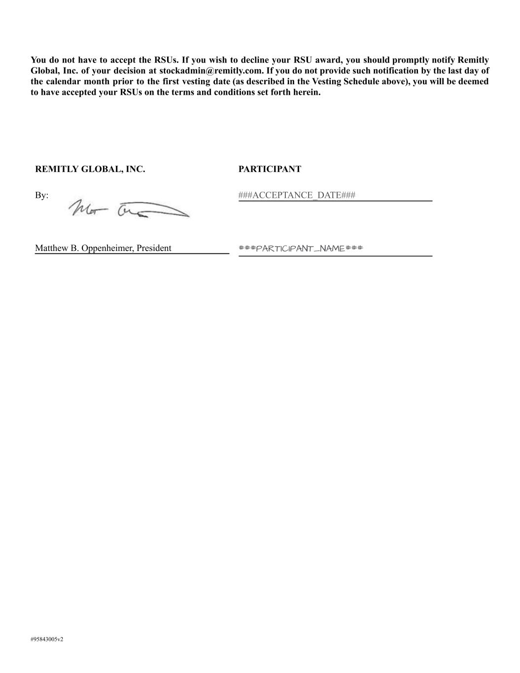 You do not have to accept the RSUs. If you wish to decline your RSU award, you should promptly notify Remitly Global, Inc. of your decision at stockadmin@remitly.com. If you do not provide such notification by the last day of the calendar month prior to the first vesting date (as described in the Vesting Schedule above), you will be deemed to have accepted your RSUs on the terms and conditions set forth herein. REMITLY GLOBAL, INC. PARTICIPANT By: ###ACCEPTANCE_DATE### Matthew B. Oppenheimer, President ###PARTICIPANT_NAME### #95843005v2