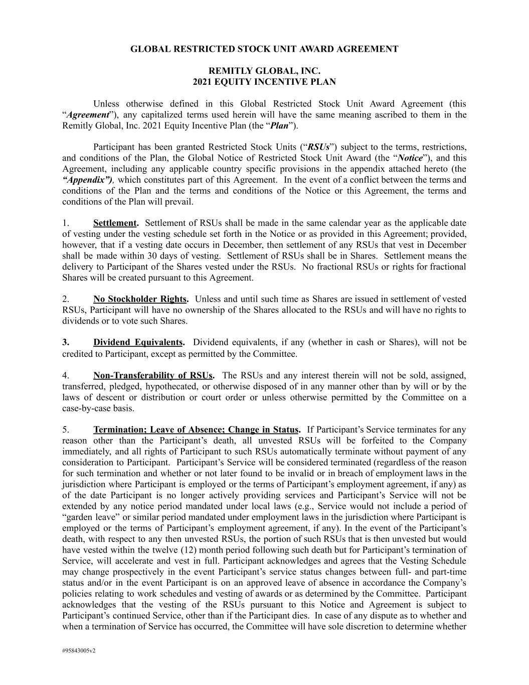 GLOBAL RESTRICTED STOCK UNIT AWARD AGREEMENT REMITLY GLOBAL, INC. 2021 EQUITY INCENTIVE PLAN Unless otherwise defined in this Global Restricted Stock Unit Award Agreement (this “Agreement”), any capitalized terms used herein will have the same meaning ascribed to them in the Remitly Global, Inc. 2021 Equity Incentive Plan (the “Plan”). Participant has been granted Restricted Stock Units (“RSUs”) subject to the terms, restrictions, and conditions of the Plan, the Global Notice of Restricted Stock Unit Award (the “Notice”), and this Agreement, including any applicable country specific provisions in the appendix attached hereto (the “Appendix”), which constitutes part of this Agreement. In the event of a conflict between the terms and conditions of the Plan and the terms and conditions of the Notice or this Agreement, the terms and conditions of the Plan will prevail. 1. Settlement. Settlement of RSUs shall be made in the same calendar year as the applicable date of vesting under the vesting schedule set forth in the Notice or as provided in this Agreement; provided, however, that if a vesting date occurs in December, then settlement of any RSUs that vest in December shall be made within 30 days of vesting. Settlement of RSUs shall be in Shares. Settlement means the delivery to Participant of the Shares vested under the RSUs. No fractional RSUs or rights for fractional Shares will be created pursuant to this Agreement. 2. No Stockholder Rights. Unless and until such time as Shares are issued in settlement of vested RSUs, Participant will have no ownership of the Shares allocated to the RSUs and will have no rights to dividends or to vote such Shares. 3. Dividend Equivalents. Dividend equivalents, if any (whether in cash or Shares), will not be credited to Participant, except as permitted by the Committee. 4. Non-Transferability of RSUs. The RSUs and any interest therein will not be sold, assigned, transferred, pledged, hypothecated, or otherwise disposed of in any manner other than by will or by the laws of descent or distribution or court order or unless otherwise permitted by the Committee on a case-by-case basis. 5. Termination; Leave of Absence; Change in Status. If Participant’s Service terminates for any reason other than the Participant’s death, all unvested RSUs will be forfeited to the Company immediately, and all rights of Participant to such RSUs automatically terminate without payment of any consideration to Participant. Participant’s Service will be considered terminated (regardless of the reason for such termination and whether or not later found to be invalid or in breach of employment laws in the jurisdiction where Participant is employed or the terms of Participant’s employment agreement, if any) as of the date Participant is no longer actively providing services and Participant’s Service will not be extended by any notice period mandated under local laws (e.g., Service would not include a period of “garden leave” or similar period mandated under employment laws in the jurisdiction where Participant is employed or the terms of Participant’s employment agreement, if any). In the event of the Participant’s death, with respect to any then unvested RSUs, the portion of such RSUs that is then unvested but would have vested within the twelve (12) month period following such death but for Participant’s termination of Service, will accelerate and vest in full. Participant acknowledges and agrees that the Vesting Schedule may change prospectively in the event Participant’s service status changes between full- and part-time status and/or in the event Participant is on an approved leave of absence in accordance the Company’s policies relating to work schedules and vesting of awards or as determined by the Committee. Participant acknowledges that the vesting of the RSUs pursuant to this Notice and Agreement is subject to Participant’s continued Service, other than if the Participant dies. In case of any dispute as to whether and when a termination of Service has occurred, the Committee will have sole discretion to determine whether #95843005v2