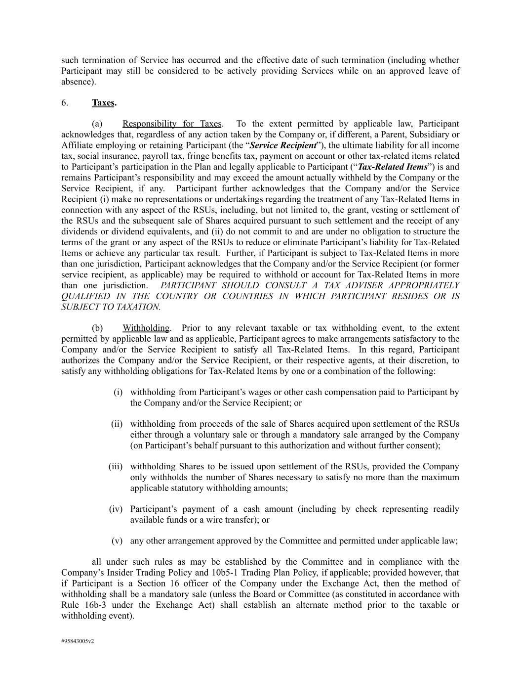 such termination of Service has occurred and the effective date of such termination (including whether Participant may still be considered to be actively providing Services while on an approved leave of absence). 6. Taxes. (a) Responsibility for Taxes. To the extent permitted by applicable law, Participant acknowledges that, regardless of any action taken by the Company or, if different, a Parent, Subsidiary or Affiliate employing or retaining Participant (the “Service Recipient”), the ultimate liability for all income tax, social insurance, payroll tax, fringe benefits tax, payment on account or other tax-related items related to Participant’s participation in the Plan and legally applicable to Participant (“Tax-Related Items”) is and remains Participant’s responsibility and may exceed the amount actually withheld by the Company or the Service Recipient, if any. Participant further acknowledges that the Company and/or the Service Recipient (i) make no representations or undertakings regarding the treatment of any Tax-Related Items in connection with any aspect of the RSUs, including, but not limited to, the grant, vesting or settlement of the RSUs and the subsequent sale of Shares acquired pursuant to such settlement and the receipt of any dividends or dividend equivalents, and (ii) do not commit to and are under no obligation to structure the terms of the grant or any aspect of the RSUs to reduce or eliminate Participant’s liability for Tax-Related Items or achieve any particular tax result. Further, if Participant is subject to Tax-Related Items in more than one jurisdiction, Participant acknowledges that the Company and/or the Service Recipient (or former service recipient, as applicable) may be required to withhold or account for Tax-Related Items in more than one jurisdiction. PARTICIPANT SHOULD CONSULT A TAX ADVISER APPROPRIATELY QUALIFIED IN THE COUNTRY OR COUNTRIES IN WHICH PARTICIPANT RESIDES OR IS SUBJECT TO TAXATION. (b) Withholding. Prior to any relevant taxable or tax withholding event, to the extent permitted by applicable law and as applicable, Participant agrees to make arrangements satisfactory to the Company and/or the Service Recipient to satisfy all Tax-Related Items. In this regard, Participant authorizes the Company and/or the Service Recipient, or their respective agents, at their discretion, to satisfy any withholding obligations for Tax-Related Items by one or a combination of the following: (i) withholding from Participant’s wages or other cash compensation paid to Participant by the Company and/or the Service Recipient; or (ii) withholding from proceeds of the sale of Shares acquired upon settlement of the RSUs either through a voluntary sale or through a mandatory sale arranged by the Company (on Participant’s behalf pursuant to this authorization and without further consent); (iii) withholding Shares to be issued upon settlement of the RSUs, provided the Company only withholds the number of Shares necessary to satisfy no more than the maximum applicable statutory withholding amounts; (iv) Participant’s payment of a cash amount (including by check representing readily available funds or a wire transfer); or (v) any other arrangement approved by the Committee and permitted under applicable law; all under such rules as may be established by the Committee and in compliance with the Company’s Insider Trading Policy and 10b5-1 Trading Plan Policy, if applicable; provided however, that if Participant is a Section 16 officer of the Company under the Exchange Act, then the method of withholding shall be a mandatory sale (unless the Board or Committee (as constituted in accordance with Rule 16b-3 under the Exchange Act) shall establish an alternate method prior to the taxable or withholding event). #95843005v2