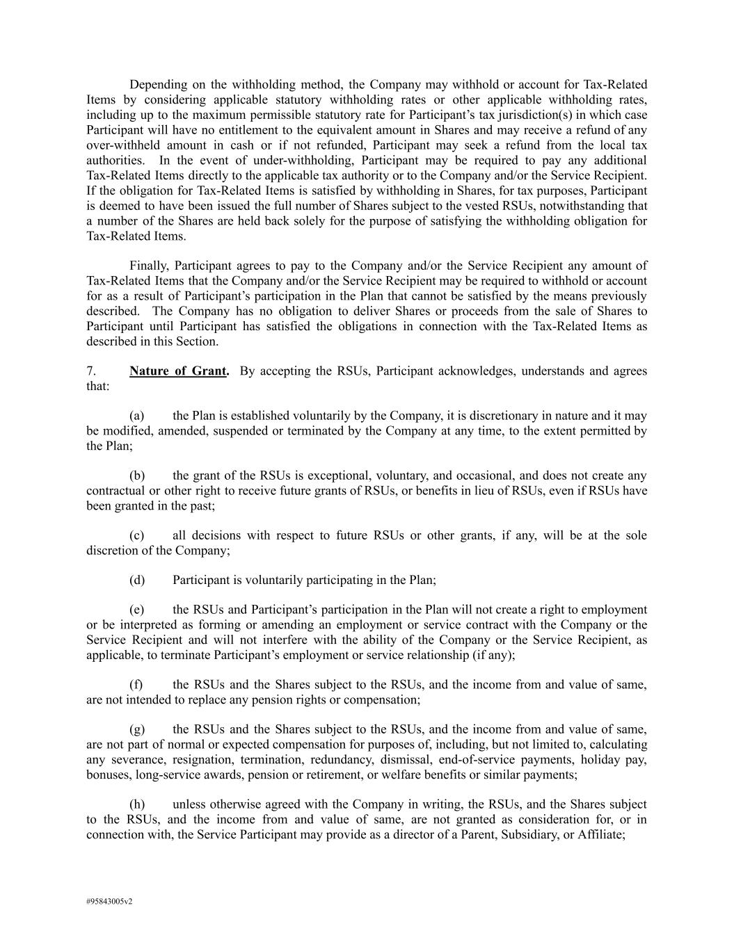 Depending on the withholding method, the Company may withhold or account for Tax-Related Items by considering applicable statutory withholding rates or other applicable withholding rates, including up to the maximum permissible statutory rate for Participant’s tax jurisdiction(s) in which case Participant will have no entitlement to the equivalent amount in Shares and may receive a refund of any over-withheld amount in cash or if not refunded, Participant may seek a refund from the local tax authorities. In the event of under-withholding, Participant may be required to pay any additional Tax-Related Items directly to the applicable tax authority or to the Company and/or the Service Recipient. If the obligation for Tax-Related Items is satisfied by withholding in Shares, for tax purposes, Participant is deemed to have been issued the full number of Shares subject to the vested RSUs, notwithstanding that a number of the Shares are held back solely for the purpose of satisfying the withholding obligation for Tax-Related Items. Finally, Participant agrees to pay to the Company and/or the Service Recipient any amount of Tax-Related Items that the Company and/or the Service Recipient may be required to withhold or account for as a result of Participant’s participation in the Plan that cannot be satisfied by the means previously described. The Company has no obligation to deliver Shares or proceeds from the sale of Shares to Participant until Participant has satisfied the obligations in connection with the Tax-Related Items as described in this Section. 7. Nature of Grant. By accepting the RSUs, Participant acknowledges, understands and agrees that: (a) the Plan is established voluntarily by the Company, it is discretionary in nature and it may be modified, amended, suspended or terminated by the Company at any time, to the extent permitted by the Plan; (b) the grant of the RSUs is exceptional, voluntary, and occasional, and does not create any contractual or other right to receive future grants of RSUs, or benefits in lieu of RSUs, even if RSUs have been granted in the past; (c) all decisions with respect to future RSUs or other grants, if any, will be at the sole discretion of the Company; (d) Participant is voluntarily participating in the Plan; (e) the RSUs and Participant’s participation in the Plan will not create a right to employment or be interpreted as forming or amending an employment or service contract with the Company or the Service Recipient and will not interfere with the ability of the Company or the Service Recipient, as applicable, to terminate Participant’s employment or service relationship (if any); (f) the RSUs and the Shares subject to the RSUs, and the income from and value of same, are not intended to replace any pension rights or compensation; (g) the RSUs and the Shares subject to the RSUs, and the income from and value of same, are not part of normal or expected compensation for purposes of, including, but not limited to, calculating any severance, resignation, termination, redundancy, dismissal, end-of-service payments, holiday pay, bonuses, long-service awards, pension or retirement, or welfare benefits or similar payments; (h) unless otherwise agreed with the Company in writing, the RSUs, and the Shares subject to the RSUs, and the income from and value of same, are not granted as consideration for, or in connection with, the Service Participant may provide as a director of a Parent, Subsidiary, or Affiliate; #95843005v2