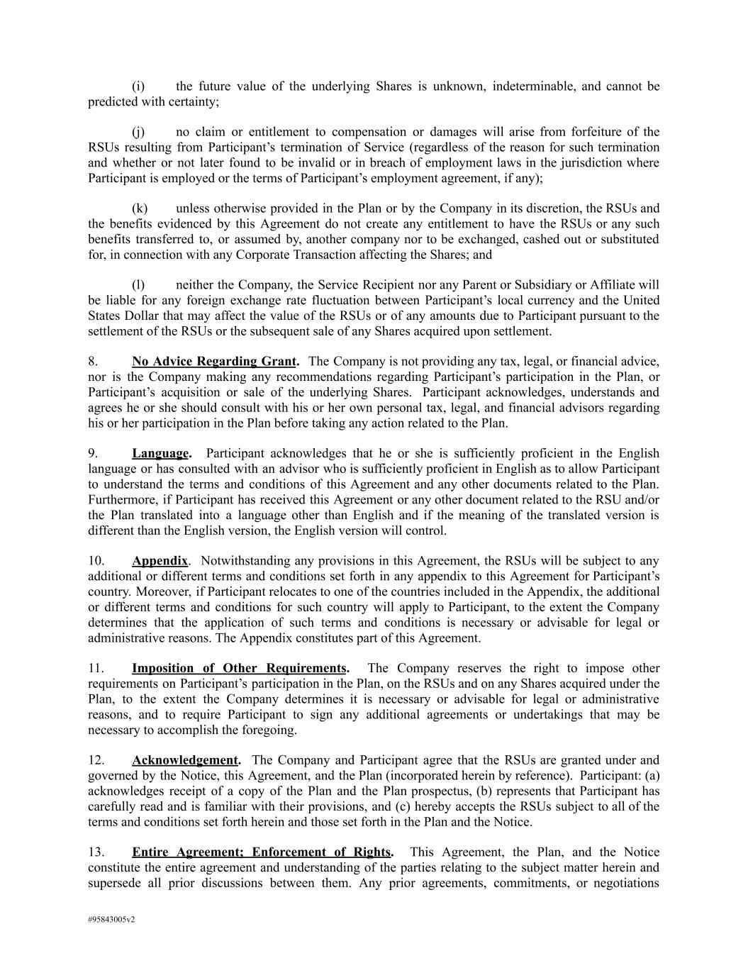 (i) the future value of the underlying Shares is unknown, indeterminable, and cannot be predicted with certainty; (j) no claim or entitlement to compensation or damages will arise from forfeiture of the RSUs resulting from Participant’s termination of Service (regardless of the reason for such termination and whether or not later found to be invalid or in breach of employment laws in the jurisdiction where Participant is employed or the terms of Participant’s employment agreement, if any); (k) unless otherwise provided in the Plan or by the Company in its discretion, the RSUs and the benefits evidenced by this Agreement do not create any entitlement to have the RSUs or any such benefits transferred to, or assumed by, another company nor to be exchanged, cashed out or substituted for, in connection with any Corporate Transaction affecting the Shares; and (l) neither the Company, the Service Recipient nor any Parent or Subsidiary or Affiliate will be liable for any foreign exchange rate fluctuation between Participant’s local currency and the United States Dollar that may affect the value of the RSUs or of any amounts due to Participant pursuant to the settlement of the RSUs or the subsequent sale of any Shares acquired upon settlement. 8. No Advice Regarding Grant. The Company is not providing any tax, legal, or financial advice, nor is the Company making any recommendations regarding Participant’s participation in the Plan, or Participant’s acquisition or sale of the underlying Shares. Participant acknowledges, understands and agrees he or she should consult with his or her own personal tax, legal, and financial advisors regarding his or her participation in the Plan before taking any action related to the Plan. 9. Language. Participant acknowledges that he or she is sufficiently proficient in the English language or has consulted with an advisor who is sufficiently proficient in English as to allow Participant to understand the terms and conditions of this Agreement and any other documents related to the Plan. Furthermore, if Participant has received this Agreement or any other document related to the RSU and/or the Plan translated into a language other than English and if the meaning of the translated version is different than the English version, the English version will control. 10. Appendix. Notwithstanding any provisions in this Agreement, the RSUs will be subject to any additional or different terms and conditions set forth in any appendix to this Agreement for Participant’s country. Moreover, if Participant relocates to one of the countries included in the Appendix, the additional or different terms and conditions for such country will apply to Participant, to the extent the Company determines that the application of such terms and conditions is necessary or advisable for legal or administrative reasons. The Appendix constitutes part of this Agreement. 11. Imposition of Other Requirements. The Company reserves the right to impose other requirements on Participant’s participation in the Plan, on the RSUs and on any Shares acquired under the Plan, to the extent the Company determines it is necessary or advisable for legal or administrative reasons, and to require Participant to sign any additional agreements or undertakings that may be necessary to accomplish the foregoing. 12. Acknowledgement. The Company and Participant agree that the RSUs are granted under and governed by the Notice, this Agreement, and the Plan (incorporated herein by reference). Participant: (a) acknowledges receipt of a copy of the Plan and the Plan prospectus, (b) represents that Participant has carefully read and is familiar with their provisions, and (c) hereby accepts the RSUs subject to all of the terms and conditions set forth herein and those set forth in the Plan and the Notice. 13. Entire Agreement; Enforcement of Rights. This Agreement, the Plan, and the Notice constitute the entire agreement and understanding of the parties relating to the subject matter herein and supersede all prior discussions between them. Any prior agreements, commitments, or negotiations #95843005v2