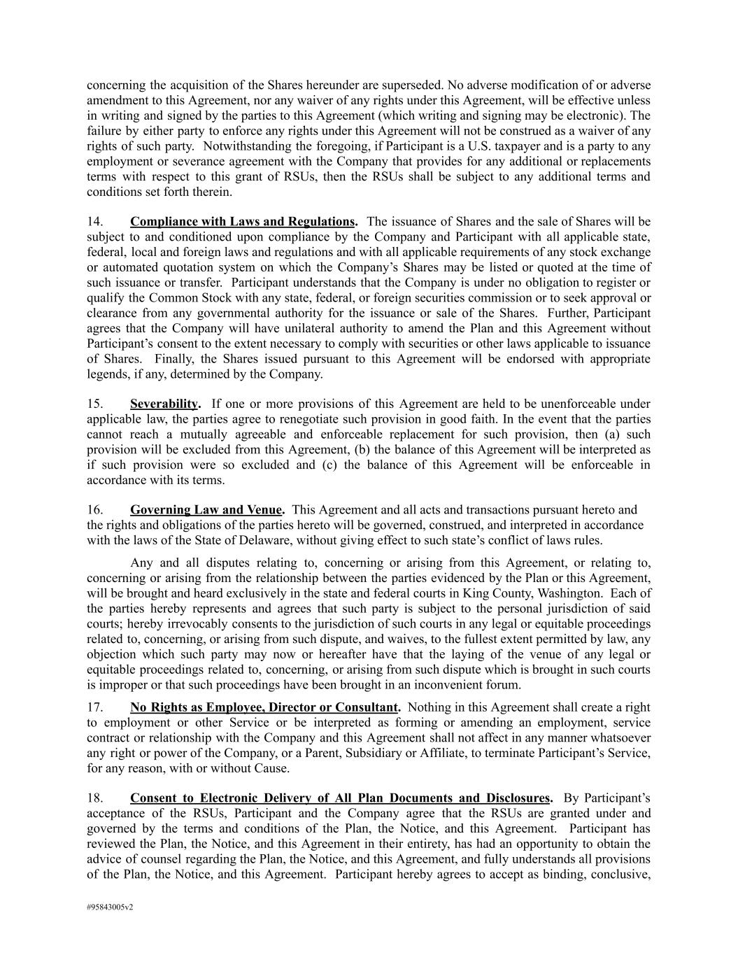 concerning the acquisition of the Shares hereunder are superseded. No adverse modification of or adverse amendment to this Agreement, nor any waiver of any rights under this Agreement, will be effective unless in writing and signed by the parties to this Agreement (which writing and signing may be electronic). The failure by either party to enforce any rights under this Agreement will not be construed as a waiver of any rights of such party. Notwithstanding the foregoing, if Participant is a U.S. taxpayer and is a party to any employment or severance agreement with the Company that provides for any additional or replacements terms with respect to this grant of RSUs, then the RSUs shall be subject to any additional terms and conditions set forth therein. 14. Compliance with Laws and Regulations. The issuance of Shares and the sale of Shares will be subject to and conditioned upon compliance by the Company and Participant with all applicable state, federal, local and foreign laws and regulations and with all applicable requirements of any stock exchange or automated quotation system on which the Company’s Shares may be listed or quoted at the time of such issuance or transfer. Participant understands that the Company is under no obligation to register or qualify the Common Stock with any state, federal, or foreign securities commission or to seek approval or clearance from any governmental authority for the issuance or sale of the Shares. Further, Participant agrees that the Company will have unilateral authority to amend the Plan and this Agreement without Participant’s consent to the extent necessary to comply with securities or other laws applicable to issuance of Shares. Finally, the Shares issued pursuant to this Agreement will be endorsed with appropriate legends, if any, determined by the Company. 15. Severability. If one or more provisions of this Agreement are held to be unenforceable under applicable law, the parties agree to renegotiate such provision in good faith. In the event that the parties cannot reach a mutually agreeable and enforceable replacement for such provision, then (a) such provision will be excluded from this Agreement, (b) the balance of this Agreement will be interpreted as if such provision were so excluded and (c) the balance of this Agreement will be enforceable in accordance with its terms. 16. Governing Law and Venue. This Agreement and all acts and transactions pursuant hereto and the rights and obligations of the parties hereto will be governed, construed, and interpreted in accordance with the laws of the State of Delaware, without giving effect to such state’s conflict of laws rules. Any and all disputes relating to, concerning or arising from this Agreement, or relating to, concerning or arising from the relationship between the parties evidenced by the Plan or this Agreement, will be brought and heard exclusively in the state and federal courts in King County, Washington. Each of the parties hereby represents and agrees that such party is subject to the personal jurisdiction of said courts; hereby irrevocably consents to the jurisdiction of such courts in any legal or equitable proceedings related to, concerning, or arising from such dispute, and waives, to the fullest extent permitted by law, any objection which such party may now or hereafter have that the laying of the venue of any legal or equitable proceedings related to, concerning, or arising from such dispute which is brought in such courts is improper or that such proceedings have been brought in an inconvenient forum. 17. No Rights as Employee, Director or Consultant. Nothing in this Agreement shall create a right to employment or other Service or be interpreted as forming or amending an employment, service contract or relationship with the Company and this Agreement shall not affect in any manner whatsoever any right or power of the Company, or a Parent, Subsidiary or Affiliate, to terminate Participant’s Service, for any reason, with or without Cause. 18. Consent to Electronic Delivery of All Plan Documents and Disclosures. By Participant’s acceptance of the RSUs, Participant and the Company agree that the RSUs are granted under and governed by the terms and conditions of the Plan, the Notice, and this Agreement. Participant has reviewed the Plan, the Notice, and this Agreement in their entirety, has had an opportunity to obtain the advice of counsel regarding the Plan, the Notice, and this Agreement, and fully understands all provisions of the Plan, the Notice, and this Agreement. Participant hereby agrees to accept as binding, conclusive, #95843005v2