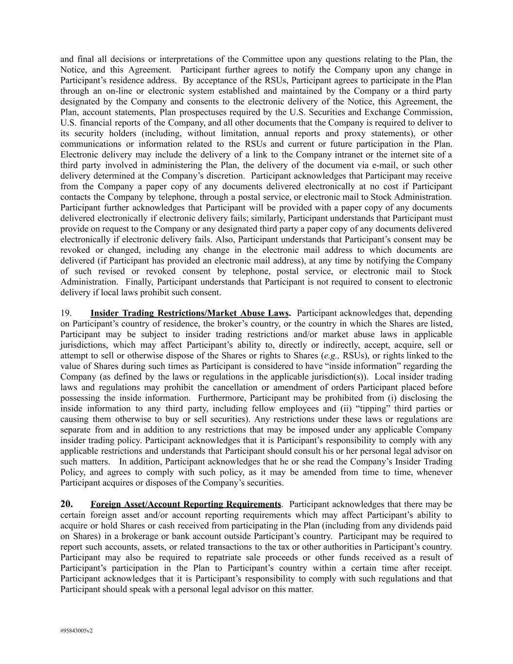 and final all decisions or interpretations of the Committee upon any questions relating to the Plan, the Notice, and this Agreement. Participant further agrees to notify the Company upon any change in Participant’s residence address. By acceptance of the RSUs, Participant agrees to participate in the Plan through an on-line or electronic system established and maintained by the Company or a third party designated by the Company and consents to the electronic delivery of the Notice, this Agreement, the Plan, account statements, Plan prospectuses required by the U.S. Securities and Exchange Commission, U.S. financial reports of the Company, and all other documents that the Company is required to deliver to its security holders (including, without limitation, annual reports and proxy statements), or other communications or information related to the RSUs and current or future participation in the Plan. Electronic delivery may include the delivery of a link to the Company intranet or the internet site of a third party involved in administering the Plan, the delivery of the document via e-mail, or such other delivery determined at the Company’s discretion. Participant acknowledges that Participant may receive from the Company a paper copy of any documents delivered electronically at no cost if Participant contacts the Company by telephone, through a postal service, or electronic mail to Stock Administration. Participant further acknowledges that Participant will be provided with a paper copy of any documents delivered electronically if electronic delivery fails; similarly, Participant understands that Participant must provide on request to the Company or any designated third party a paper copy of any documents delivered electronically if electronic delivery fails. Also, Participant understands that Participant’s consent may be revoked or changed, including any change in the electronic mail address to which documents are delivered (if Participant has provided an electronic mail address), at any time by notifying the Company of such revised or revoked consent by telephone, postal service, or electronic mail to Stock Administration. Finally, Participant understands that Participant is not required to consent to electronic delivery if local laws prohibit such consent. 19. Insider Trading Restrictions/Market Abuse Laws. Participant acknowledges that, depending on Participant’s country of residence, the broker’s country, or the country in which the Shares are listed, Participant may be subject to insider trading restrictions and/or market abuse laws in applicable jurisdictions, which may affect Participant’s ability to, directly or indirectly, accept, acquire, sell or attempt to sell or otherwise dispose of the Shares or rights to Shares (e.g., RSUs), or rights linked to the value of Shares during such times as Participant is considered to have “inside information” regarding the Company (as defined by the laws or regulations in the applicable jurisdiction(s)). Local insider trading laws and regulations may prohibit the cancellation or amendment of orders Participant placed before possessing the inside information. Furthermore, Participant may be prohibited from (i) disclosing the inside information to any third party, including fellow employees and (ii) “tipping” third parties or causing them otherwise to buy or sell securities). Any restrictions under these laws or regulations are separate from and in addition to any restrictions that may be imposed under any applicable Company insider trading policy. Participant acknowledges that it is Participant’s responsibility to comply with any applicable restrictions and understands that Participant should consult his or her personal legal advisor on such matters. In addition, Participant acknowledges that he or she read the Company’s Insider Trading Policy, and agrees to comply with such policy, as it may be amended from time to time, whenever Participant acquires or disposes of the Company’s securities. 20. Foreign Asset/Account Reporting Requirements. Participant acknowledges that there may be certain foreign asset and/or account reporting requirements which may affect Participant’s ability to acquire or hold Shares or cash received from participating in the Plan (including from any dividends paid on Shares) in a brokerage or bank account outside Participant’s country. Participant may be required to report such accounts, assets, or related transactions to the tax or other authorities in Participant’s country. Participant may also be required to repatriate sale proceeds or other funds received as a result of Participant’s participation in the Plan to Participant’s country within a certain time after receipt. Participant acknowledges that it is Participant’s responsibility to comply with such regulations and that Participant should speak with a personal legal advisor on this matter. #95843005v2