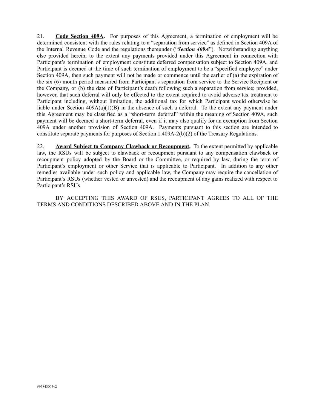 21. Code Section 409A. For purposes of this Agreement, a termination of employment will be determined consistent with the rules relating to a “separation from service” as defined in Section 409A of the Internal Revenue Code and the regulations thereunder (“Section 409A”). Notwithstanding anything else provided herein, to the extent any payments provided under this Agreement in connection with Participant’s termination of employment constitute deferred compensation subject to Section 409A, and Participant is deemed at the time of such termination of employment to be a “specified employee” under Section 409A, then such payment will not be made or commence until the earlier of (a) the expiration of the six (6) month period measured from Participant’s separation from service to the Service Recipient or the Company, or (b) the date of Participant’s death following such a separation from service; provided, however, that such deferral will only be effected to the extent required to avoid adverse tax treatment to Participant including, without limitation, the additional tax for which Participant would otherwise be liable under Section 409A(a)(1)(B) in the absence of such a deferral. To the extent any payment under this Agreement may be classified as a “short-term deferral” within the meaning of Section 409A, such payment will be deemed a short-term deferral, even if it may also qualify for an exemption from Section 409A under another provision of Section 409A. Payments pursuant to this section are intended to constitute separate payments for purposes of Section 1.409A-2(b)(2) of the Treasury Regulations. 22. Award Subject to Company Clawback or Recoupment. To the extent permitted by applicable law, the RSUs will be subject to clawback or recoupment pursuant to any compensation clawback or recoupment policy adopted by the Board or the Committee, or required by law, during the term of Participant’s employment or other Service that is applicable to Participant. In addition to any other remedies available under such policy and applicable law, the Company may require the cancellation of Participant’s RSUs (whether vested or unvested) and the recoupment of any gains realized with respect to Participant’s RSUs. BY ACCEPTING THIS AWARD OF RSUS, PARTICIPANT AGREES TO ALL OF THE TERMS AND CONDITIONS DESCRIBED ABOVE AND IN THE PLAN. #95843005v2