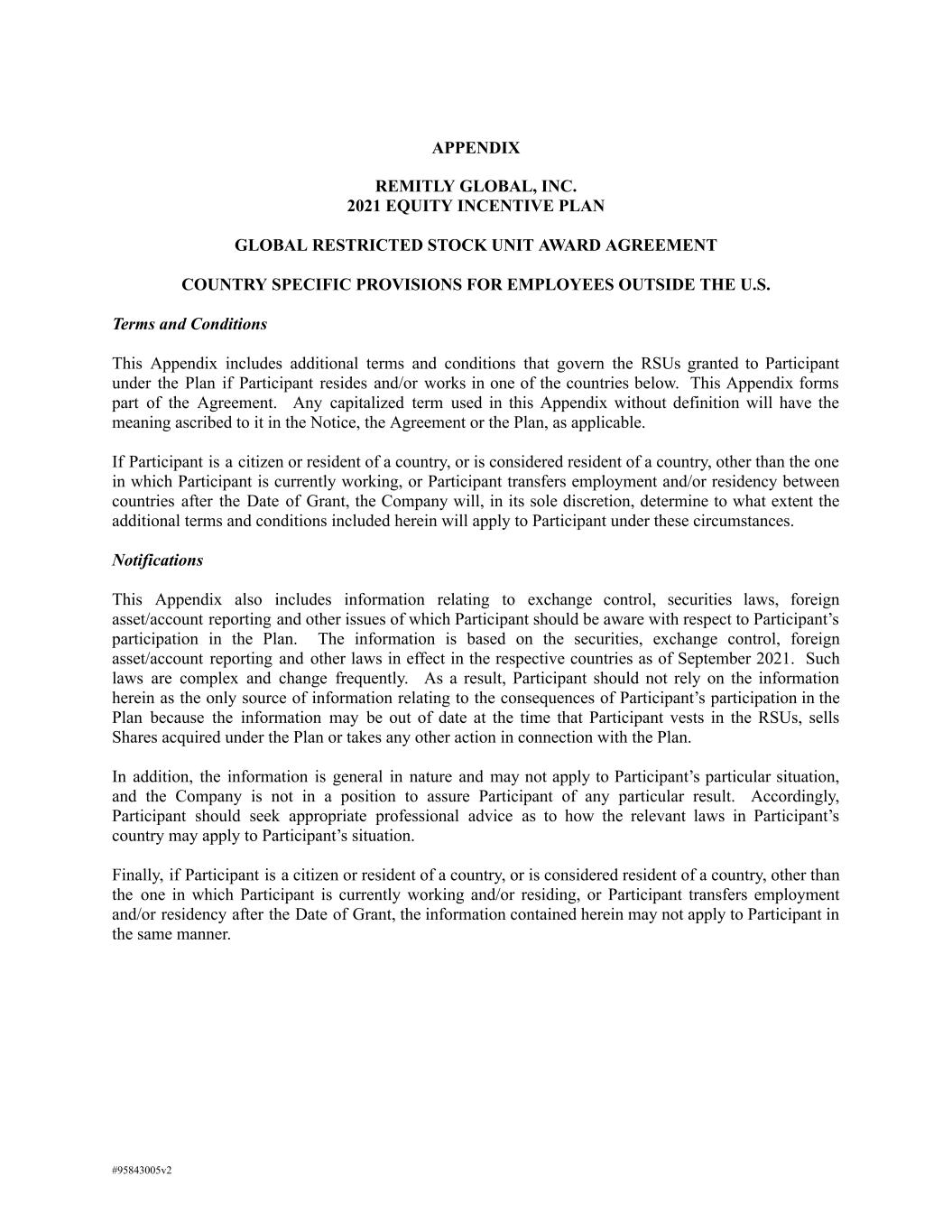 APPENDIX REMITLY GLOBAL, INC. 2021 EQUITY INCENTIVE PLAN GLOBAL RESTRICTED STOCK UNIT AWARD AGREEMENT COUNTRY SPECIFIC PROVISIONS FOR EMPLOYEES OUTSIDE THE U.S. Terms and Conditions This Appendix includes additional terms and conditions that govern the RSUs granted to Participant under the Plan if Participant resides and/or works in one of the countries below. This Appendix forms part of the Agreement. Any capitalized term used in this Appendix without definition will have the meaning ascribed to it in the Notice, the Agreement or the Plan, as applicable. If Participant is a citizen or resident of a country, or is considered resident of a country, other than the one in which Participant is currently working, or Participant transfers employment and/or residency between countries after the Date of Grant, the Company will, in its sole discretion, determine to what extent the additional terms and conditions included herein will apply to Participant under these circumstances. Notifications This Appendix also includes information relating to exchange control, securities laws, foreign asset/account reporting and other issues of which Participant should be aware with respect to Participant’s participation in the Plan. The information is based on the securities, exchange control, foreign asset/account reporting and other laws in effect in the respective countries as of September 2021. Such laws are complex and change frequently. As a result, Participant should not rely on the information herein as the only source of information relating to the consequences of Participant’s participation in the Plan because the information may be out of date at the time that Participant vests in the RSUs, sells Shares acquired under the Plan or takes any other action in connection with the Plan. In addition, the information is general in nature and may not apply to Participant’s particular situation, and the Company is not in a position to assure Participant of any particular result. Accordingly, Participant should seek appropriate professional advice as to how the relevant laws in Participant’s country may apply to Participant’s situation. Finally, if Participant is a citizen or resident of a country, or is considered resident of a country, other than the one in which Participant is currently working and/or residing, or Participant transfers employment and/or residency after the Date of Grant, the information contained herein may not apply to Participant in the same manner. #95843005v2