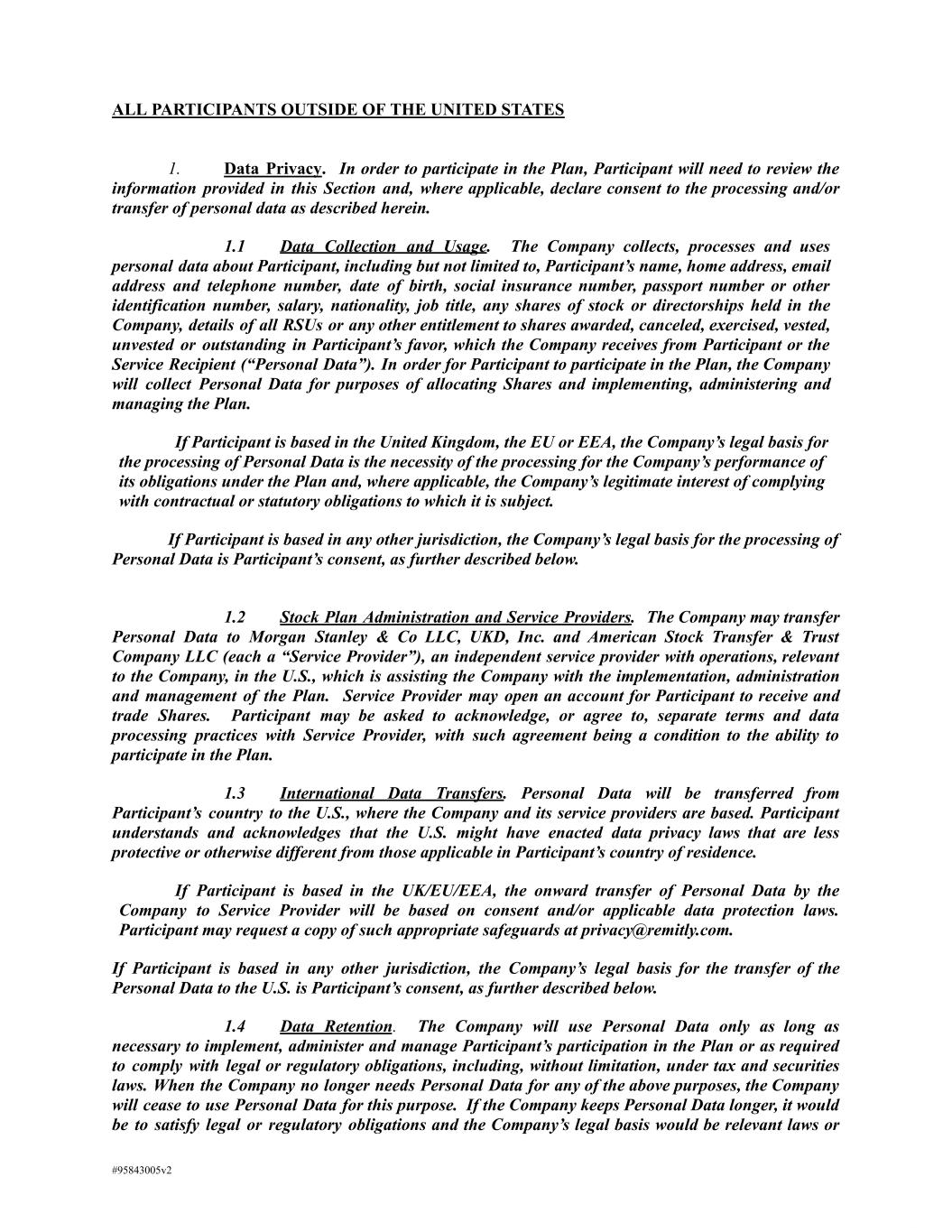 ALL PARTICIPANTS OUTSIDE OF THE UNITED STATES 1. Data Privacy. In order to participate in the Plan, Participant will need to review the information provided in this Section and, where applicable, declare consent to the processing and/or transfer of personal data as described herein. 1.1 Data Collection and Usage. The Company collects, processes and uses personal data about Participant, including but not limited to, Participant’s name, home address, email address and telephone number, date of birth, social insurance number, passport number or other identification number, salary, nationality, job title, any shares of stock or directorships held in the Company, details of all RSUs or any other entitlement to shares awarded, canceled, exercised, vested, unvested or outstanding in Participant’s favor, which the Company receives from Participant or the Service Recipient (“Personal Data”). In order for Participant to participate in the Plan, the Company will collect Personal Data for purposes of allocating Shares and implementing, administering and managing the Plan. If Participant is based in the United Kingdom, the EU or EEA, the Company’s legal basis for the processing of Personal Data is the necessity of the processing for the Company’s performance of its obligations under the Plan and, where applicable, the Company’s legitimate interest of complying with contractual or statutory obligations to which it is subject. If Participant is based in any other jurisdiction, the Company’s legal basis for the processing of Personal Data is Participant’s consent, as further described below. 1.2 Stock Plan Administration and Service Providers. The Company may transfer Personal Data to Morgan Stanley & Co LLC, UKD, Inc. and American Stock Transfer & Trust Company LLC (each a “Service Provider”), an independent service provider with operations, relevant to the Company, in the U.S., which is assisting the Company with the implementation, administration and management of the Plan. Service Provider may open an account for Participant to receive and trade Shares. Participant may be asked to acknowledge, or agree to, separate terms and data processing practices with Service Provider, with such agreement being a condition to the ability to participate in the Plan. 1.3 International Data Transfers. Personal Data will be transferred from Participant’s country to the U.S., where the Company and its service providers are based. Participant understands and acknowledges that the U.S. might have enacted data privacy laws that are less protective or otherwise different from those applicable in Participant’s country of residence. If Participant is based in the UK/EU/EEA, the onward transfer of Personal Data by the Company to Service Provider will be based on consent and/or applicable data protection laws. Participant may request a copy of such appropriate safeguards at privacy@remitly.com. If Participant is based in any other jurisdiction, the Company’s legal basis for the transfer of the Personal Data to the U.S. is Participant’s consent, as further described below. 1.4 Data Retention. The Company will use Personal Data only as long as necessary to implement, administer and manage Participant’s participation in the Plan or as required to comply with legal or regulatory obligations, including, without limitation, under tax and securities laws. When the Company no longer needs Personal Data for any of the above purposes, the Company will cease to use Personal Data for this purpose. If the Company keeps Personal Data longer, it would be to satisfy legal or regulatory obligations and the Company’s legal basis would be relevant laws or #95843005v2