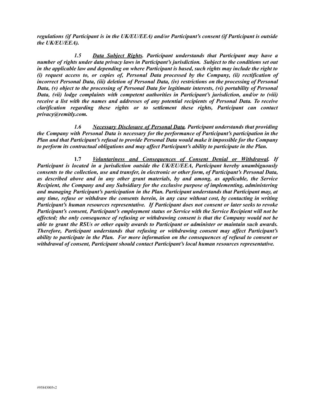 regulations (if Participant is in the UK/EU/EEA) and/or Participant’s consent (if Participant is outside the UK/EU/EEA). 1.5 Data Subject Rights. Participant understands that Participant may have a number of rights under data privacy laws in Participant’s jurisdiction. Subject to the conditions set out in the applicable law and depending on where Participant is based, such rights may include the right to (i) request access to, or copies of, Personal Data processed by the Company, (ii) rectification of incorrect Personal Data, (iii) deletion of Personal Data, (iv) restrictions on the processing of Personal Data, (v) object to the processing of Personal Data for legitimate interests, (vi) portability of Personal Data, (vii) lodge complaints with competent authorities in Participant’s jurisdiction, and/or to (viii) receive a list with the names and addresses of any potential recipients of Personal Data. To receive clarification regarding these rights or to settlement these rights, Participant can contact privacy@remitly.com. 1.6 Necessary Disclosure of Personal Data. Participant understands that providing the Company with Personal Data is necessary for the performance of Participant’s participation in the Plan and that Participant’s refusal to provide Personal Data would make it impossible for the Company to perform its contractual obligations and may affect Participant’s ability to participate in the Plan. 1.7 Voluntariness and Consequences of Consent Denial or Withdrawal. If Participant is located in a jurisdiction outside the UK/EU/EEA, Participant hereby unambiguously consents to the collection, use and transfer, in electronic or other form, of Participant’s Personal Data, as described above and in any other grant materials, by and among, as applicable, the Service Recipient, the Company and any Subsidiary for the exclusive purpose of implementing, administering and managing Participant’s participation in the Plan. Participant understands that Participant may, at any time, refuse or withdraw the consents herein, in any case without cost, by contacting in writing Participant’s human resources representative. If Participant does not consent or later seeks to revoke Participant’s consent, Participant’s employment status or Service with the Service Recipient will not be affected; the only consequence of refusing or withdrawing consent is that the Company would not be able to grant the RSUs or other equity awards to Participant or administer or maintain such awards. Therefore, Participant understands that refusing or withdrawing consent may affect Participant’s ability to participate in the Plan. For more information on the consequences of refusal to consent or withdrawal of consent, Participant should contact Participant’s local human resources representative. #95843005v2