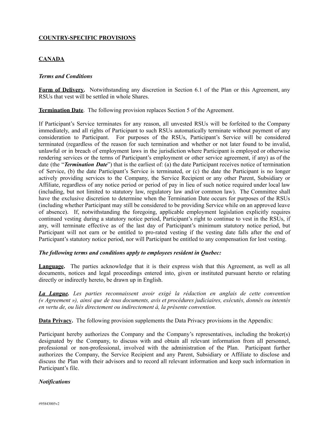 COUNTRY-SPECIFIC PROVISIONS CANADA Terms and Conditions Form of Delivery. Notwithstanding any discretion in Section 6.1 of the Plan or this Agreement, any RSUs that vest will be settled in whole Shares. Termination Date. The following provision replaces Section 5 of the Agreement. If Participant’s Service terminates for any reason, all unvested RSUs will be forfeited to the Company immediately, and all rights of Participant to such RSUs automatically terminate without payment of any consideration to Participant. For purposes of the RSUs, Participant’s Service will be considered terminated (regardless of the reason for such termination and whether or not later found to be invalid, unlawful or in breach of employment laws in the jurisdiction where Participant is employed or otherwise rendering services or the terms of Participant’s employment or other service agreement, if any) as of the date (the “Termination Date”) that is the earliest of: (a) the date Participant receives notice of termination of Service, (b) the date Participant’s Service is terminated, or (c) the date the Participant is no longer actively providing services to the Company, the Service Recipient or any other Parent, Subsidiary or Affiliate, regardless of any notice period or period of pay in lieu of such notice required under local law (including, but not limited to statutory law, regulatory law and/or common law). The Committee shall have the exclusive discretion to determine when the Termination Date occurs for purposes of the RSUs (including whether Participant may still be considered to be providing Service while on an approved leave of absence). If, notwithstanding the foregoing, applicable employment legislation explicitly requires continued vesting during a statutory notice period, Participant’s right to continue to vest in the RSUs, if any, will terminate effective as of the last day of Participant’s minimum statutory notice period, but Participant will not earn or be entitled to pro-rated vesting if the vesting date falls after the end of Participant’s statutory notice period, nor will Participant be entitled to any compensation for lost vesting. The following terms and conditions apply to employees resident in Quebec: Language. The parties acknowledge that it is their express wish that this Agreement, as well as all documents, notices and legal proceedings entered into, given or instituted pursuant hereto or relating directly or indirectly hereto, be drawn up in English. La Langue. Les parties reconnaissent avoir exigé la rédaction en anglais de cette convention (« Agreement »), ainsi que de tous documents, avis et procédures judiciaires, exécutés, donnés ou intentés en vertu de, ou liés directement ou indirectement à, la présente convention. Data Privacy. The following provision supplements the Data Privacy provisions in the Appendix: Participant hereby authorizes the Company and the Company’s representatives, including the broker(s) designated by the Company, to discuss with and obtain all relevant information from all personnel, professional or non-professional, involved with the administration of the Plan. Participant further authorizes the Company, the Service Recipient and any Parent, Subsidiary or Affiliate to disclose and discuss the Plan with their advisors and to record all relevant information and keep such information in Participant’s file. Notifications #95843005v2