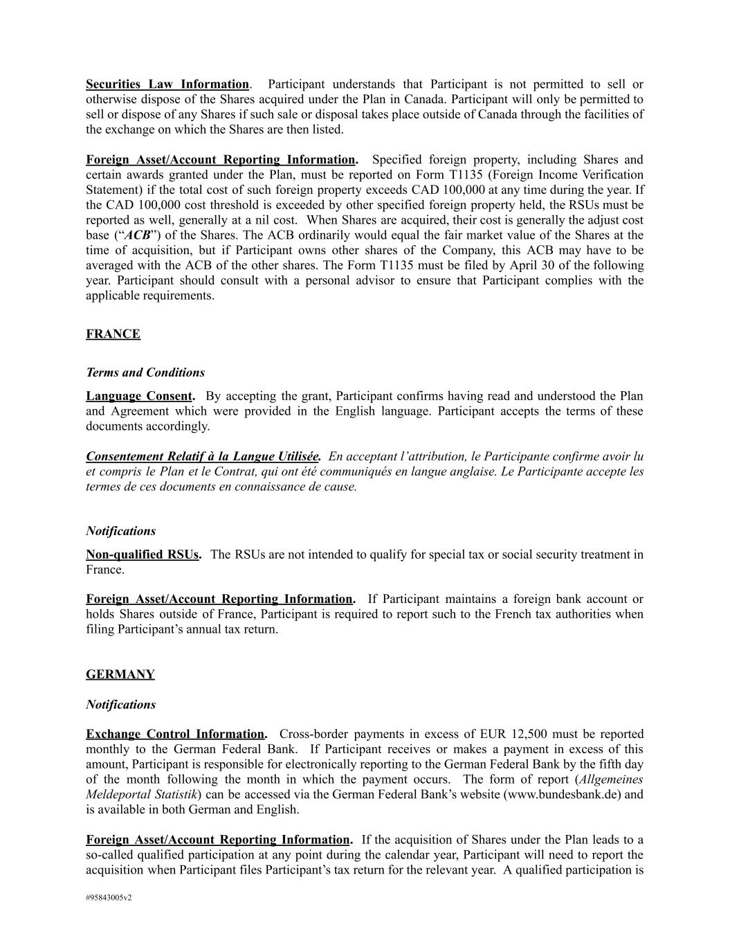 Securities Law Information. Participant understands that Participant is not permitted to sell or otherwise dispose of the Shares acquired under the Plan in Canada. Participant will only be permitted to sell or dispose of any Shares if such sale or disposal takes place outside of Canada through the facilities of the exchange on which the Shares are then listed. Foreign Asset/Account Reporting Information. Specified foreign property, including Shares and certain awards granted under the Plan, must be reported on Form T1135 (Foreign Income Verification Statement) if the total cost of such foreign property exceeds CAD 100,000 at any time during the year. If the CAD 100,000 cost threshold is exceeded by other specified foreign property held, the RSUs must be reported as well, generally at a nil cost. When Shares are acquired, their cost is generally the adjust cost base (“ACB”) of the Shares. The ACB ordinarily would equal the fair market value of the Shares at the time of acquisition, but if Participant owns other shares of the Company, this ACB may have to be averaged with the ACB of the other shares. The Form T1135 must be filed by April 30 of the following year. Participant should consult with a personal advisor to ensure that Participant complies with the applicable requirements. FRANCE Terms and Conditions Language Consent. By accepting the grant, Participant confirms having read and understood the Plan and Agreement which were provided in the English language. Participant accepts the terms of these documents accordingly. Consentement Relatif à la Langue Utilisée. En acceptant l’attribution, le Participante confirme avoir lu et compris le Plan et le Contrat, qui ont été communiqués en langue anglaise. Le Participante accepte les termes de ces documents en connaissance de cause. Notifications Non-qualified RSUs. The RSUs are not intended to qualify for special tax or social security treatment in France. Foreign Asset/Account Reporting Information. If Participant maintains a foreign bank account or holds Shares outside of France, Participant is required to report such to the French tax authorities when filing Participant’s annual tax return. GERMANY Notifications Exchange Control Information. Cross-border payments in excess of EUR 12,500 must be reported monthly to the German Federal Bank. If Participant receives or makes a payment in excess of this amount, Participant is responsible for electronically reporting to the German Federal Bank by the fifth day of the month following the month in which the payment occurs. The form of report (Allgemeines Meldeportal Statistik) can be accessed via the German Federal Bank’s website (www.bundesbank.de) and is available in both German and English. Foreign Asset/Account Reporting Information. If the acquisition of Shares under the Plan leads to a so-called qualified participation at any point during the calendar year, Participant will need to report the acquisition when Participant files Participant’s tax return for the relevant year. A qualified participation is #95843005v2