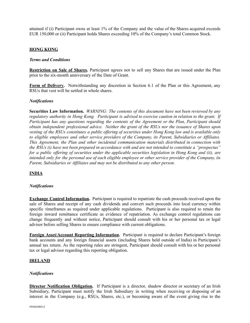 attained if (i) Participant owns at least 1% of the Company and the value of the Shares acquired exceeds EUR 150,000 or (ii) Participant holds Shares exceeding 10% of the Company’s total Common Stock. HONG KONG Terms and Conditions Restriction on Sale of Shares. Participant agrees not to sell any Shares that are issued under the Plan prior to the six-month anniversary of the Date of Grant. Form of Delivery. Notwithstanding any discretion in Section 6.1 of the Plan or this Agreement, any RSUs that vest will be settled in whole shares. Notifications Securities Law Information. WARNING: The contents of this document have not been reviewed by any regulatory authority in Hong Kong. Participant is advised to exercise caution in relation to the grant. If Participant has any questions regarding the contents of the Agreement or the Plan, Participant should obtain independent professional advice. Neither the grant of the RSUs nor the issuance of Shares upon vesting of the RSUs constitutes a public offering of securities under Hong Kong law and is available only to eligible employees and other service providers of the Company, its Parent, Subsidiaries or Affiliates. This Agreement, the Plan and other incidental communication materials distributed in connection with the RSUs (i) have not been prepared in accordance with and are not intended to constitute a “prospectus” for a public offering of securities under the applicable securities legislation in Hong Kong and (ii), are intended only for the personal use of each eligible employee or other service provider of the Company, its Parent, Subsidiaries or Affiliates and may not be distributed to any other person. INDIA Notifications Exchange Control Information. Participant is required to repatriate the cash proceeds received upon the sale of Shares and receipt of any cash dividends and convert such proceeds into local currency within specific timeframes as required under applicable regulations. Participant is also required to retain the foreign inward remittance certificate as evidence of repatriation. As exchange control regulations can change frequently and without notice, Participant should consult with his or her personal tax or legal advisor before selling Shares to ensure compliance with current obligations. Foreign Asset/Account Reporting Information. Participant is required to declare Participant’s foreign bank accounts and any foreign financial assets (including Shares held outside of India) in Participant’s annual tax return. As the reporting rules are stringent, Participant should consult with his or her personal tax or legal advisor regarding this reporting obligation. IRELAND Notifications Director Notification Obligation. If Participant is a director, shadow director or secretary of an Irish Subsidiary, Participant must notify the Irish Subsidiary in writing when receiving or disposing of an interest in the Company (e.g., RSUs, Shares, etc.), or becoming aware of the event giving rise to the #95843005v2