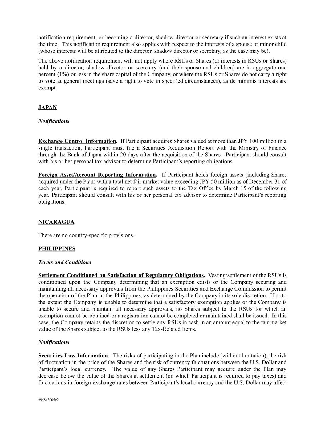 notification requirement, or becoming a director, shadow director or secretary if such an interest exists at the time. This notification requirement also applies with respect to the interests of a spouse or minor child (whose interests will be attributed to the director, shadow director or secretary, as the case may be). The above notification requirement will not apply where RSUs or Shares (or interests in RSUs or Shares) held by a director, shadow director or secretary (and their spouse and children) are in aggregate one percent (1%) or less in the share capital of the Company, or where the RSUs or Shares do not carry a right to vote at general meetings (save a right to vote in specified circumstances), as de minimis interests are exempt. JAPAN Notifications Exchange Control Information. If Participant acquires Shares valued at more than JPY 100 million in a single transaction, Participant must file a Securities Acquisition Report with the Ministry of Finance through the Bank of Japan within 20 days after the acquisition of the Shares. Participant should consult with his or her personal tax advisor to determine Participant’s reporting obligations. Foreign Asset/Account Reporting Information. If Participant holds foreign assets (including Shares acquired under the Plan) with a total net fair market value exceeding JPY 50 million as of December 31 of each year, Participant is required to report such assets to the Tax Office by March 15 of the following year. Participant should consult with his or her personal tax advisor to determine Participant’s reporting obligations. NICARAGUA There are no country-specific provisions. PHILIPPINES Terms and Conditions Settlement Conditioned on Satisfaction of Regulatory Obligations. Vesting/settlement of the RSUs is conditioned upon the Company determining that an exemption exists or the Company securing and maintaining all necessary approvals from the Philippines Securities and Exchange Commission to permit the operation of the Plan in the Philippines, as determined by the Company in its sole discretion. If or to the extent the Company is unable to determine that a satisfactory exemption applies or the Company is unable to secure and maintain all necessary approvals, no Shares subject to the RSUs for which an exemption cannot be obtained or a registration cannot be completed or maintained shall be issued. In this case, the Company retains the discretion to settle any RSUs in cash in an amount equal to the fair market value of the Shares subject to the RSUs less any Tax-Related Items. Notifications Securities Law Information. The risks of participating in the Plan include (without limitation), the risk of fluctuation in the price of the Shares and the risk of currency fluctuations between the U.S. Dollar and Participant’s local currency. The value of any Shares Participant may acquire under the Plan may decrease below the value of the Shares at settlement (on which Participant is required to pay taxes) and fluctuations in foreign exchange rates between Participant’s local currency and the U.S. Dollar may affect #95843005v2